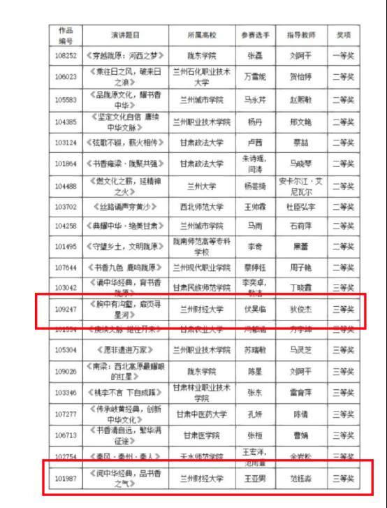 近日,甘肃省教育厅语言文字工作委员会办公室公布了“典耀中华 书香陇原”全省大中小学生主题演讲获奖名单。本次比赛由甘肃省教育厅主办,兰州文理学院承办,来自甘肃省百余所大中小学的选手参赛,分为小学、初中、高中、高校四个组别进行演讲比赛,共有167件作品。beat365两名学生荣获高校组三等奖两项,展现了兰财青年学子昂扬向上、奋发进取的精神风貌。
