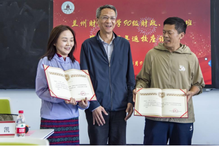 胡凯为两名校友颁发了校友联络大使证书。马润平用《我们都是追梦人》表达了校友们不怕万里路遥,选择兰商为自己梦想的启航;借用《送别》将深深的《祝福》送给全体校友;希望大家《常回家看看》,为母校的发展添砖加瓦!张宗军、李永海分别向校友们介绍了金融学院、财政与税务学院的最新发展和今后的规划。教师代表李东海、常向东分别共忆师生情谊。