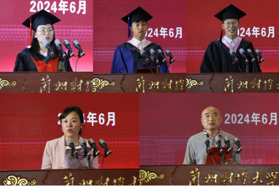 博士毕业生代表、统计与数据科学学院马爱琴同学,硕士毕业生代表、财政与税务学院陆胤同学,本科毕业生代表、工商管理学院王仁民同学,教师代表赵庆龄老师和毕业生家长代表张俊同志、校友代表、北京大学新结构经济学研究院研究员、新结构经济学知识产权研究院副院长、博士生导师、新结构经济学研究联盟副秘书长、北京大学光华管理学院经济学博士赵秋运教授发言依次发言。