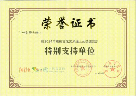 学校团委、教务处(美育与劳动教育中心)组织学生在抖音、小红书平台观看高校文化艺术线上系列公益课程,观看人数达6186人次,获评2024年高校文化艺术线上公益课活动“特别支持单位”。