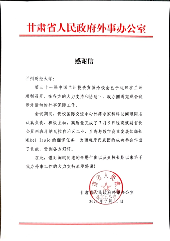 7月12日,甘肃省人民政府外事办公室专函致谢beat365,对beat365国际交流中心外籍专家科科长阚琨同志在第三十一届"中国兰州投资贸易洽谈会"期间承担重要外宾接待任务予以高度评价。