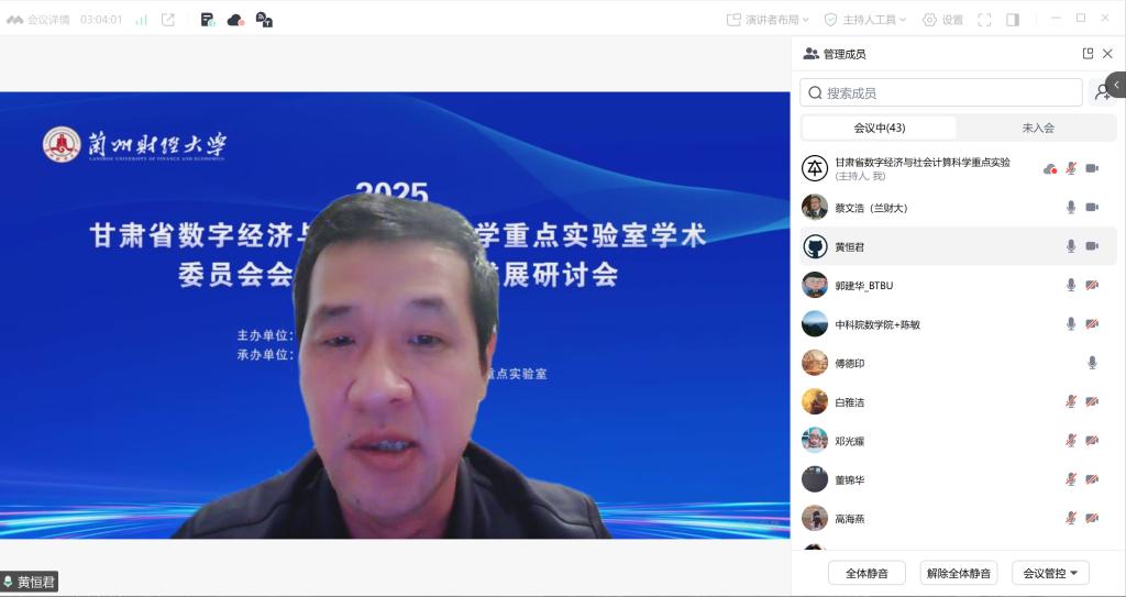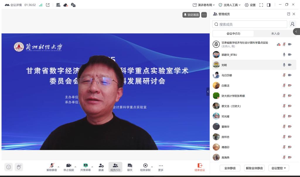 11月23日,2025甘肃省数字经济与社会计算科学重点实验室学术委员会会议暨统计学科发展研讨会会议在线上成功举办。学校党委常委、副校长黄恒君出席会议并致辞。甘肃省数字经济与社会计算科学重点实验室学术委员会主任、北京工商大学校长郭建华,中国科学院研究员、全国工业统计学教学研究会会长陈敏,北京大学时空大数据协同创新中心专家委员董锦华,教育部统计学教指委主任委员、北京大学教授房祥忠,中国劳动关系学院校长傅德印,首都经济贸易大学教授、北京大数据与统计科学研究院院长、北京大数据办会会长纪宏,南方科技大学教授荆炳义,浙江财经大学党委书记、教育部经济学教指委副主任委员李金昌,兰州大方电子有限责任公司总经理李晓纯,南特数码科技集团董事长兼总裁南振岐,中国人民大学统计学院院长、统计学学科评议组委员王晓军,南开大学数学科学学院院长、统计学学科评议组主任委员王兆军,清华大学教授、中国数学会概率统计学会副理事长杨瑛,中国人民大学统计与大数据研究院院长朱利平,复旦大学教授朱仲义等专家委员及重点实验室部分教师代表参加了会议。本次会议聚焦数字经济与统计学科前沿,汇聚各方智慧,为学科发展与实验室建设提供新思路。