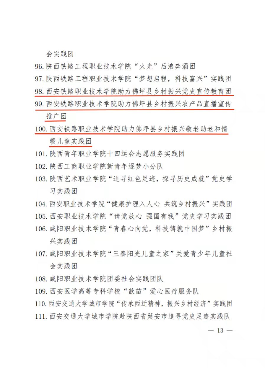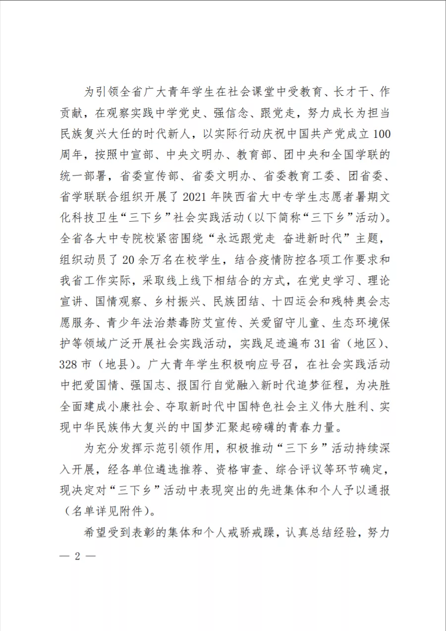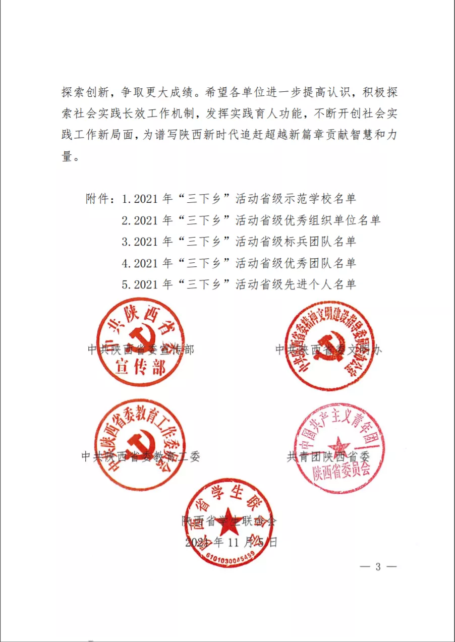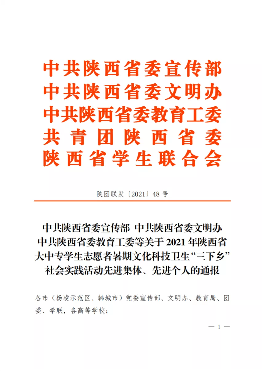 近日,陕西省委宣传部、陕西省委文明办、陕西省委教育工委、共青团陕西省委、陕西省学生联合会联合发文对2021年陕西省大中专学生志愿者暑期“三下乡”社会实践活动先进集体、先进个人进行了通报与表彰(《中共陕西省委宣传部 中共陕西省委文明办 中共陕西省委教育工委等关于2021年陕西省大中专学生志愿者暑期文化科技卫生“三下乡”社会实践活动先进集体、先进个人的通报》陕团联发[2021] 48号)。永利官网荣获2021年“三下乡”活动“省级示范学校”称号,永利官网助力佛坪县乡村振兴的党史宣传教育团、农产品直播宣传推广团、敬老助老情暖儿童实践团获“省级优秀团队”称号,院团委李妮、田辰两位同志获“省级先进个人”称号。