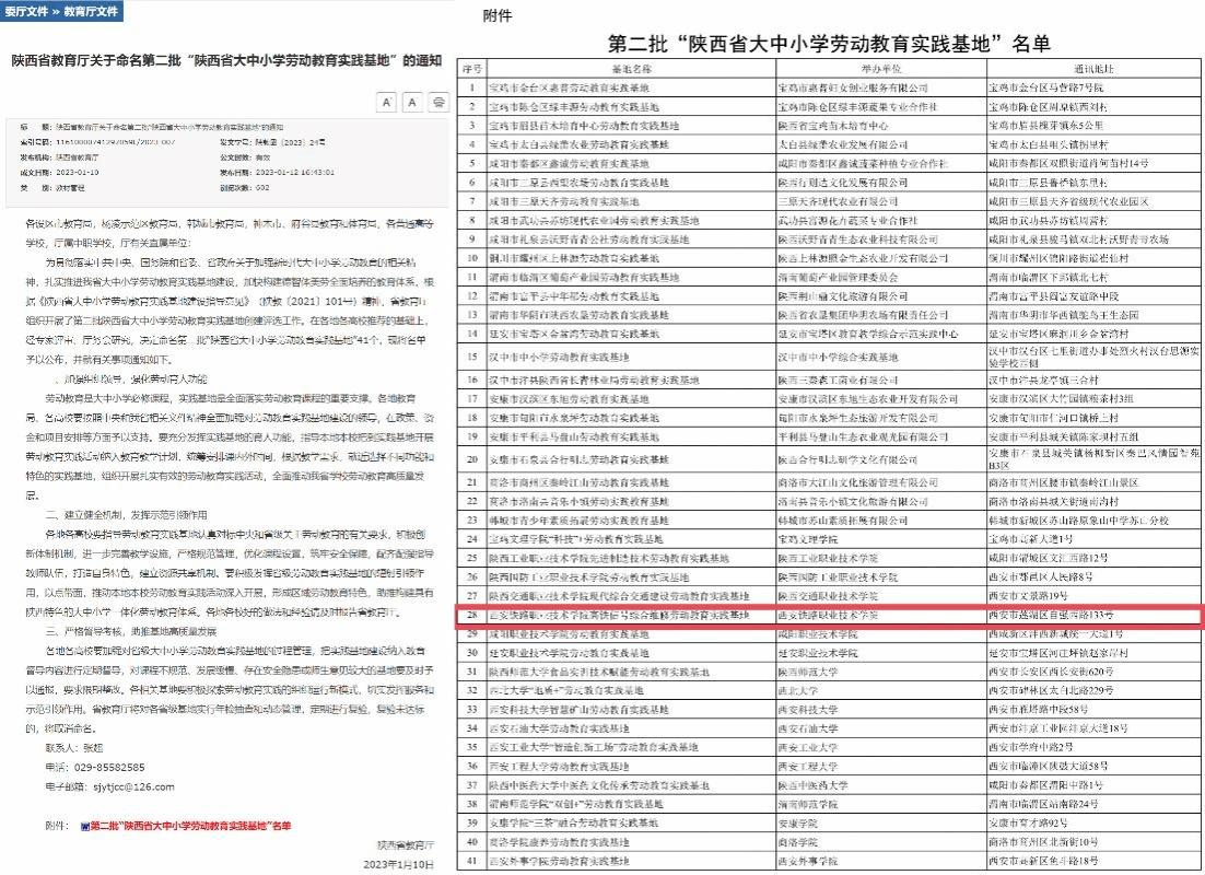 根据陕西省教育厅办公室《陕西省教育厅关于命名第二批“陕西省大中小学劳动教育实践基地”的通知》(陕教函〔2023〕24号),永利官网高铁信号综合维修劳动教育实践基地成功获批第二批“陕西省大中小学劳动教育实践基地”。
