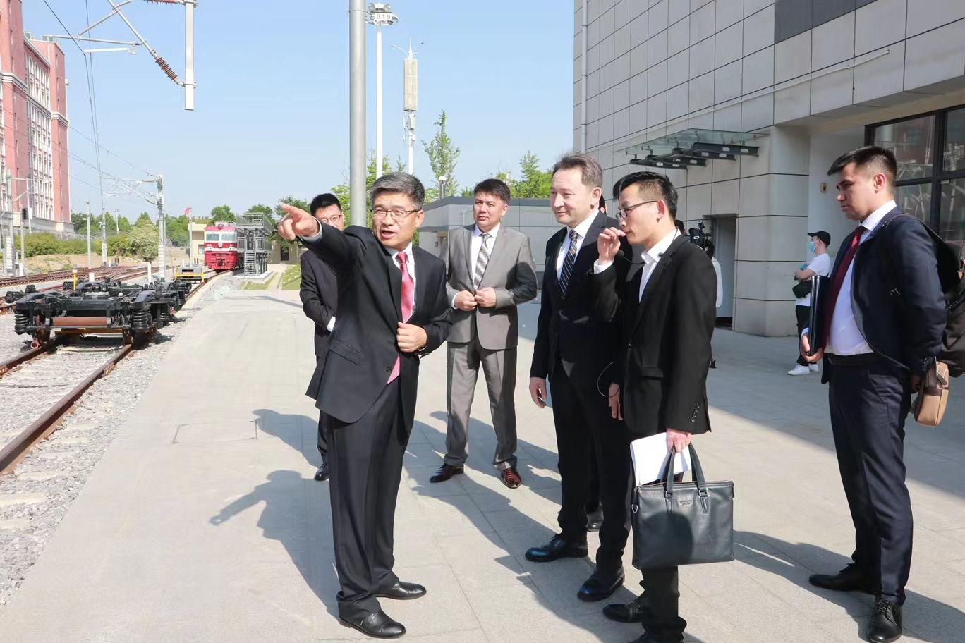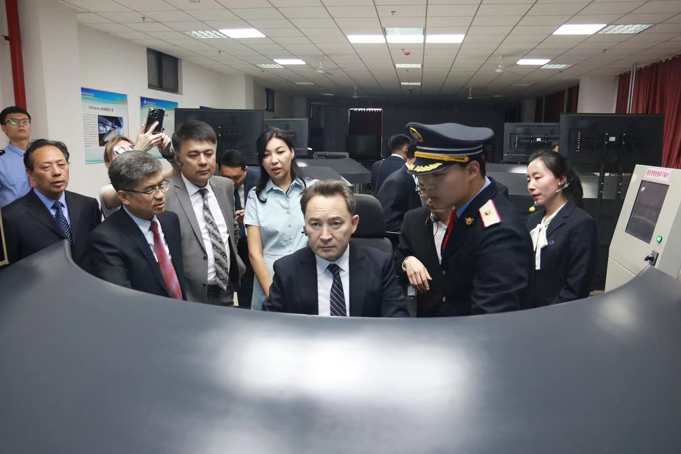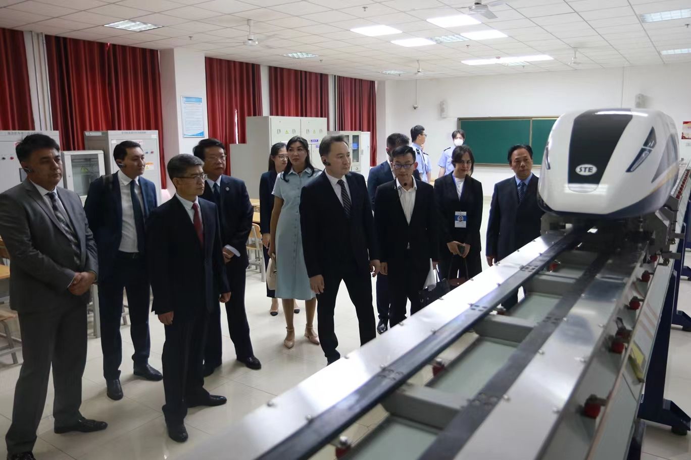 在签约仪式前,迈拉姆·贝根塔耶夫一行在赵春平和熊奇的陪同下实地参观了牵引动力、机电工程、电气工程三个二级学院的动车组模拟驾驶实训室、磁悬浮列车实训室、复兴号动车组模拟驾驶实训室、铁道车辆综合演练场、高铁牵引供电调度实训室、城轨牵引变电所沙盘实训室等8个实训室和演练场,迈拉姆·贝根塔耶夫亲自进行了模拟高铁驾驶体验,他表示304am永利集团官网在轨道交通“车、机、工、电、辆、供”全部专业技术技能人才培养方面师资雄厚、实验实训设备齐全、办学声誉良好,更加坚定了深入合作交流的决心。