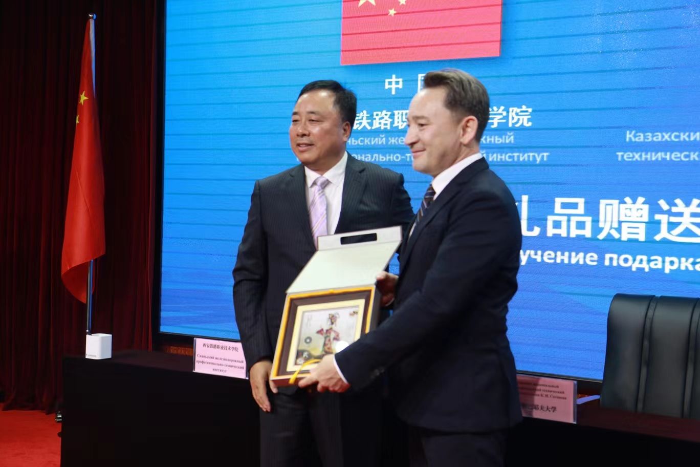 在签约仪式上,施利民与迈拉姆·贝根塔耶夫互相赠送了礼物,赵春平与迈拉姆·贝根塔耶夫代表双方签署了合作协议。根据协议双方将实现课程联通、学分互认、师生交流、专业建设、中文学习、“秦岭工坊”建设等全方位合作。
