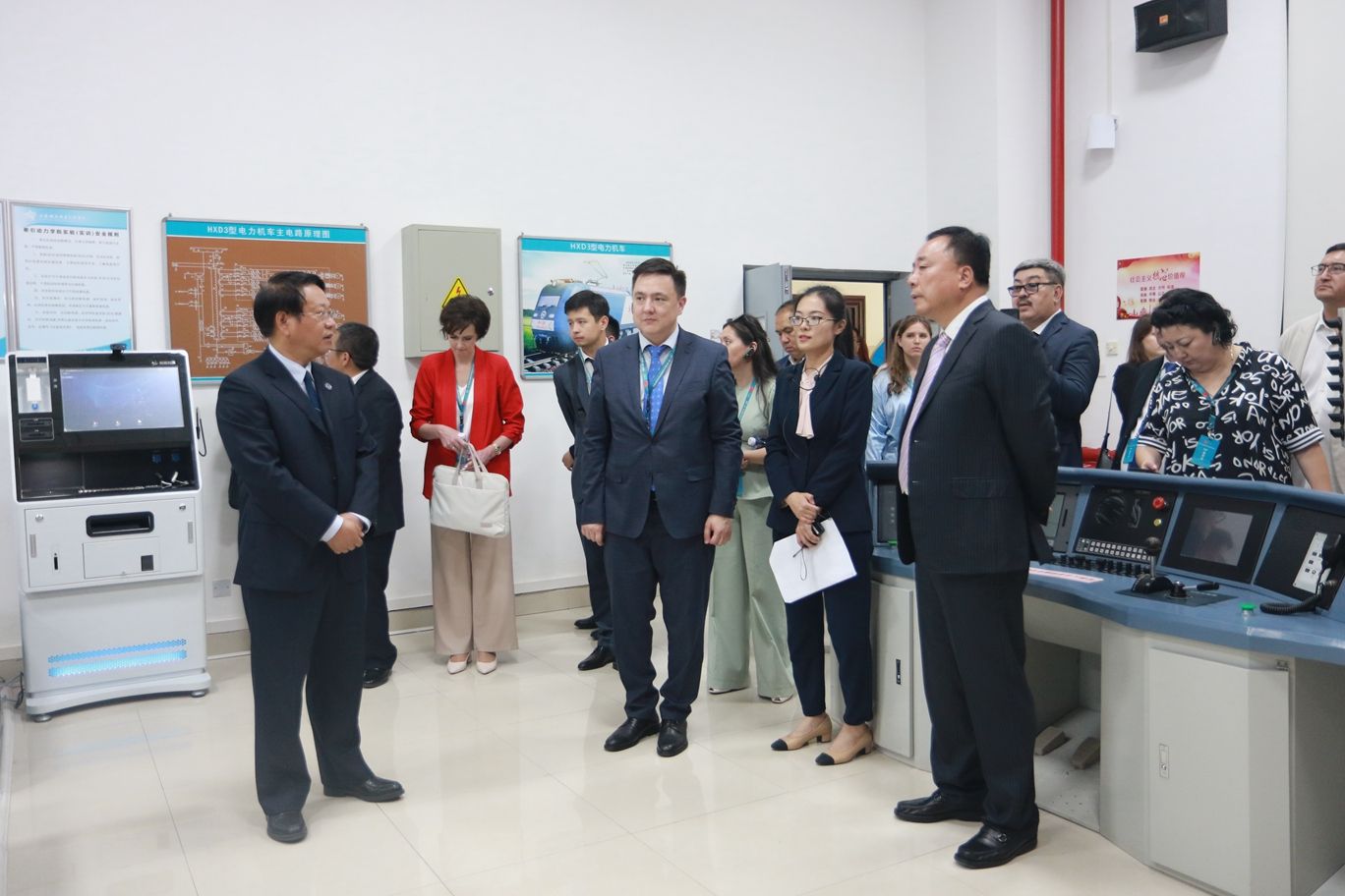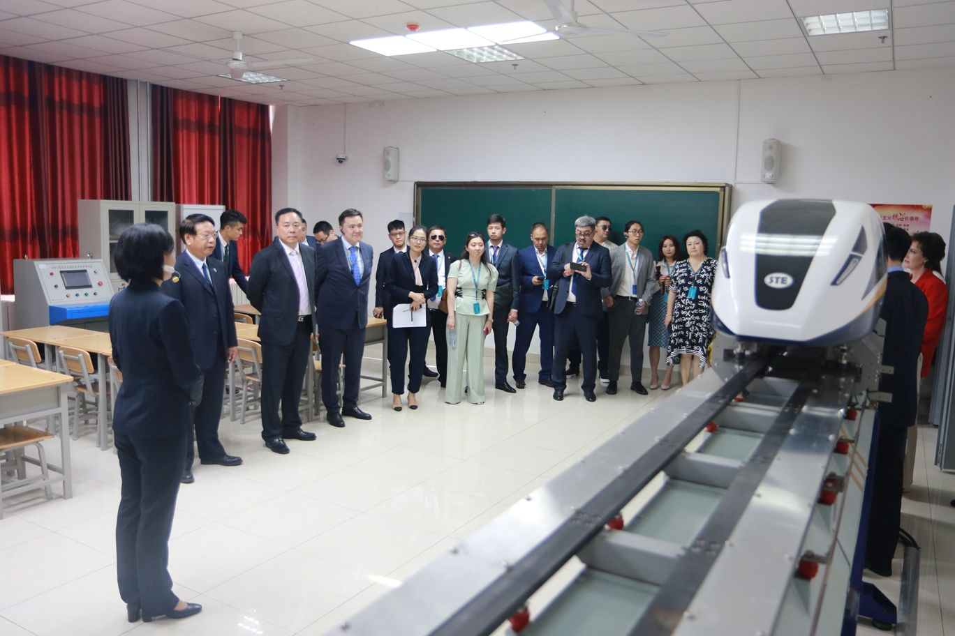 努拉利·布凯坎诺夫一行参观了学院轨道交通综合实训中心、牵引动力综合演练场、动车组模拟驾驶实训室、复兴号动车组模拟驾驶实训室、磁悬浮列车实训室等学生实训场所。