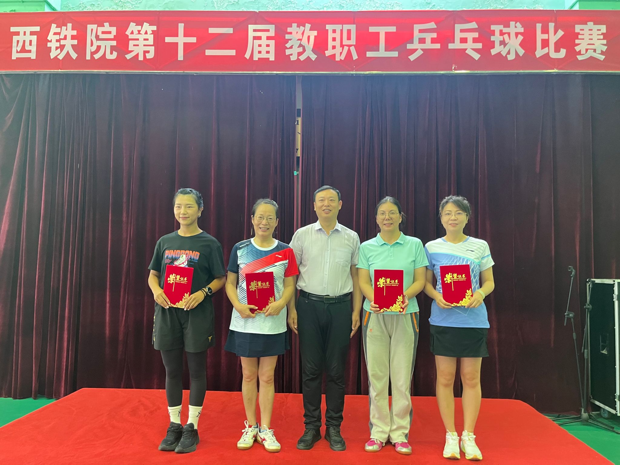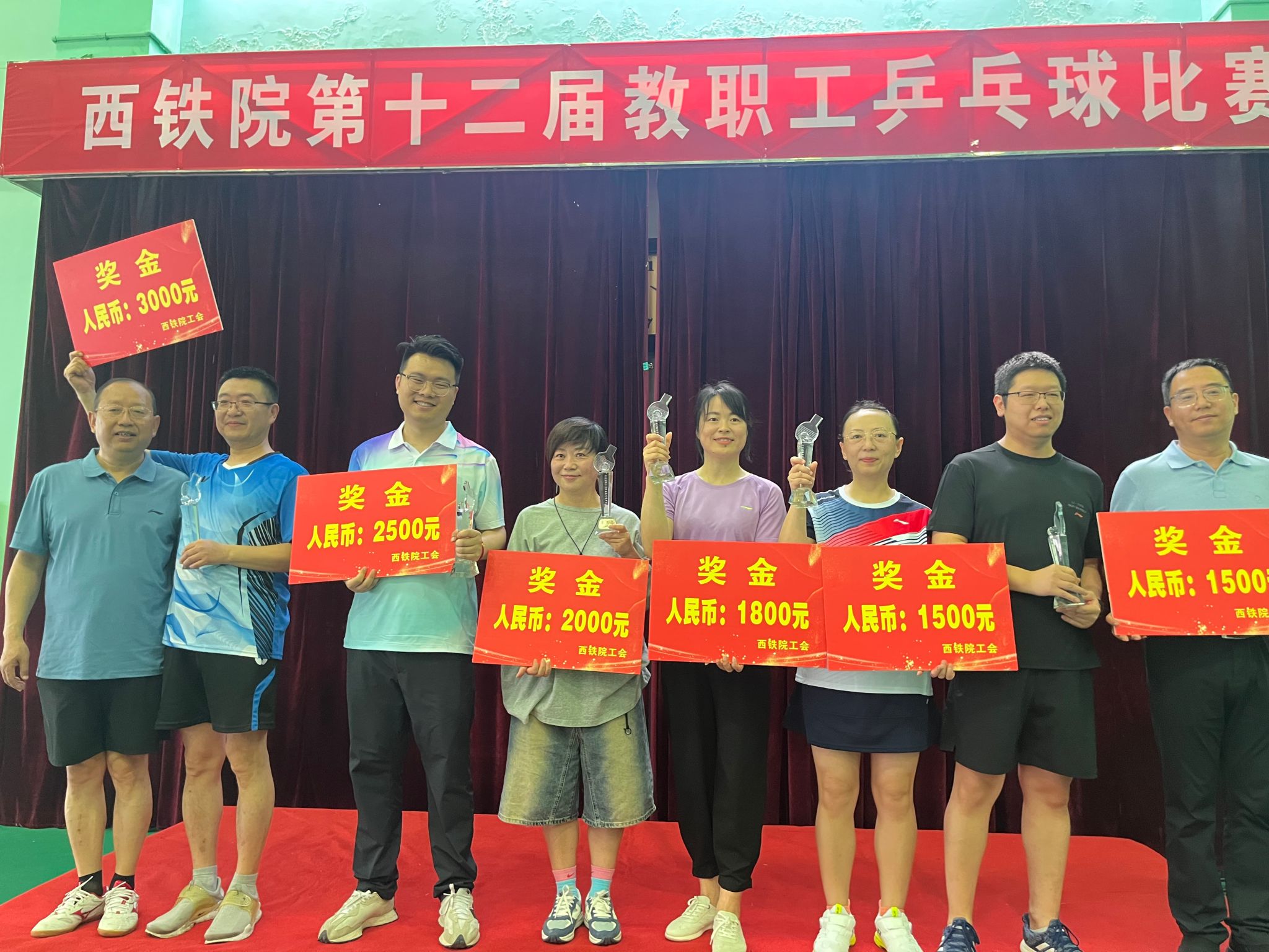 经过一天半的激烈角逐,比赛于19日中午落下帷幕,最终基础教学分会、临潼校区分会、机关后勤分会、机电工程分会代表队分获团体第一、二、三、四名;教研学工分会、牵引动力分会、电气工程分会代表队获得本次赛事的“体育道德风尚奖”;柯伟、王琛、潘杜豆、王向阳分别获得男子单打前四名;姜宇杉、马建萍、靳丽君、李静分别获得女子单打前四名。