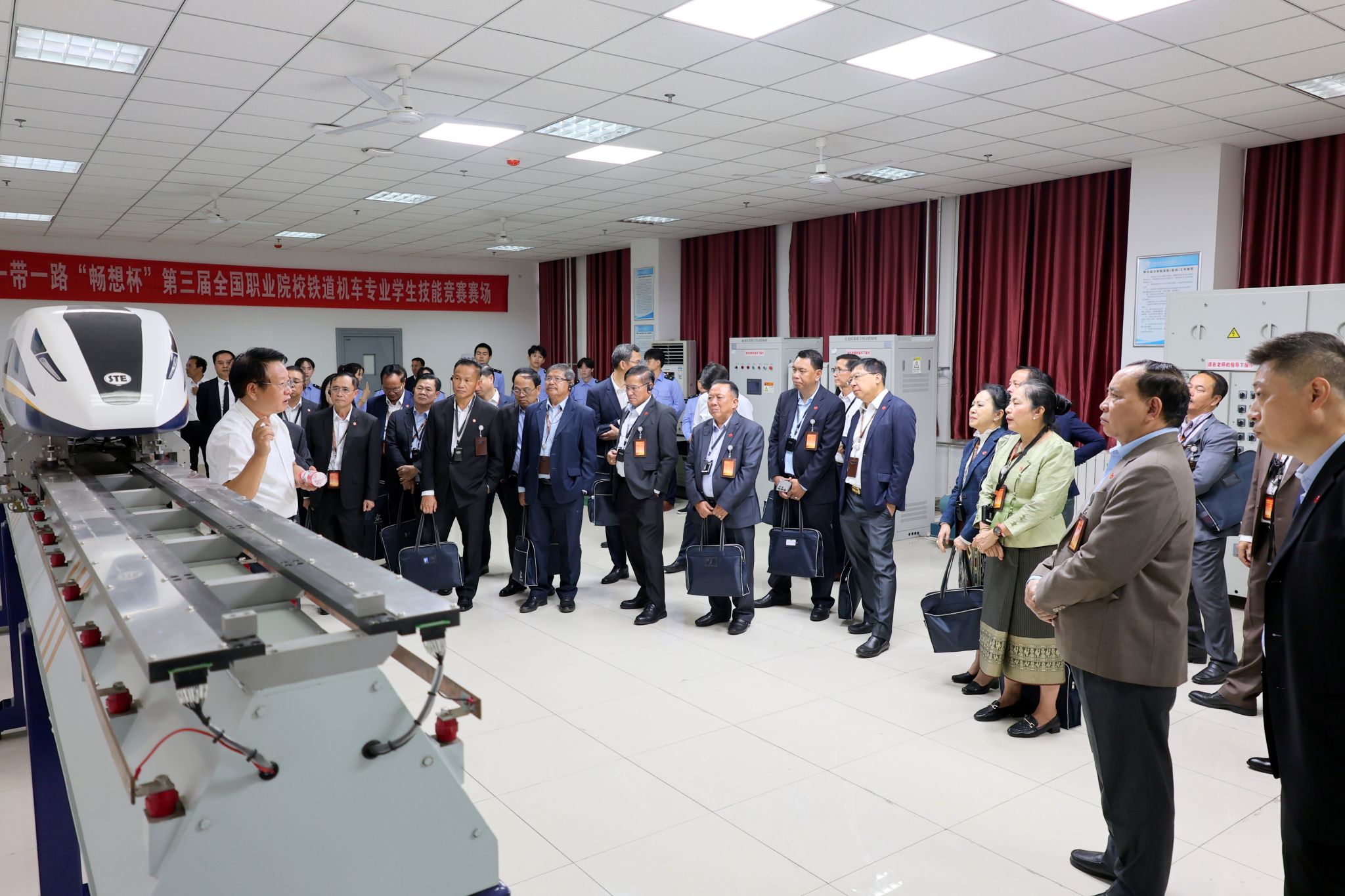 随后,在学院领导的陪同下,考察团一行参观了牵引动力学院国家级虚拟仿真实训基地、地铁模拟驾驶实训基地、复兴号模拟驾驶实训室等学生实训中心,并和老挝留学生一起体验了复兴号动车组模拟驾驶等实训基地相关项目。