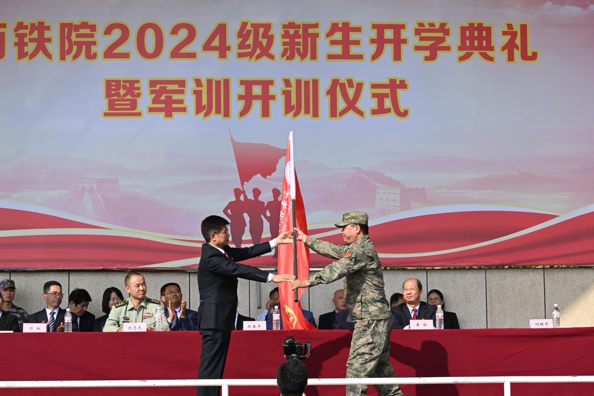 赵春平代表学院致辞,他向来自全国各地的5249名新同学表示热烈欢迎,回顾了学院悠久的办学历史和取得的发展成就。他指出,同学们正处在一个奋斗成就梦想的伟大时代,只要坚定信念、勇敢追梦,必将在新时代里书写辉煌。并向2024级新生提出了四点希望:一是敢于“主动”,主动迎接各种挑战,在实践和摸索中提高能力,锤炼品格;二是力行“负责”,对自己的行为、决策和结果负责,进而为自己的人生负责;三是追求“彻底”,像大国工匠一样追求精益求精、追求卓越;四是乐于“奉献”,在推进强国建设、民族复兴伟业中贡献青春力量。他强调,“主动、负责、彻底、奉献”是西铁院精神,同学们需以此为指引,在接下来的军训中严格要求自己,展现纪律意识和团队精神,为未来的学习与生活奠定坚实基础。勉励同学们永远保持对技能技术的渴望,对工匠精神的崇尚,珍惜这宝贵的大学三年,在西铁院启航,沐光新时代,努力成长为能工巧匠、大国工匠,努力做技能强国的优秀践行者。