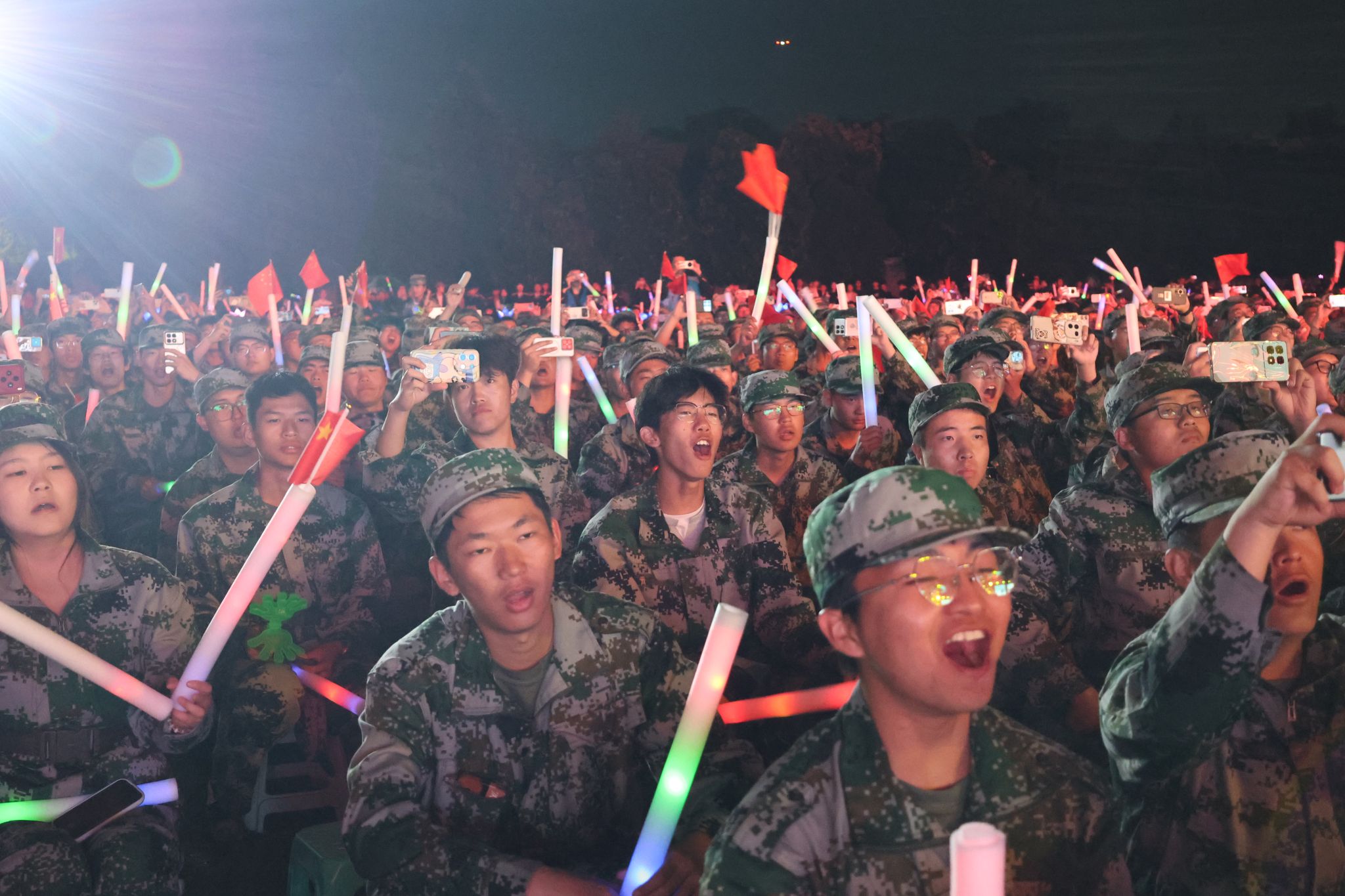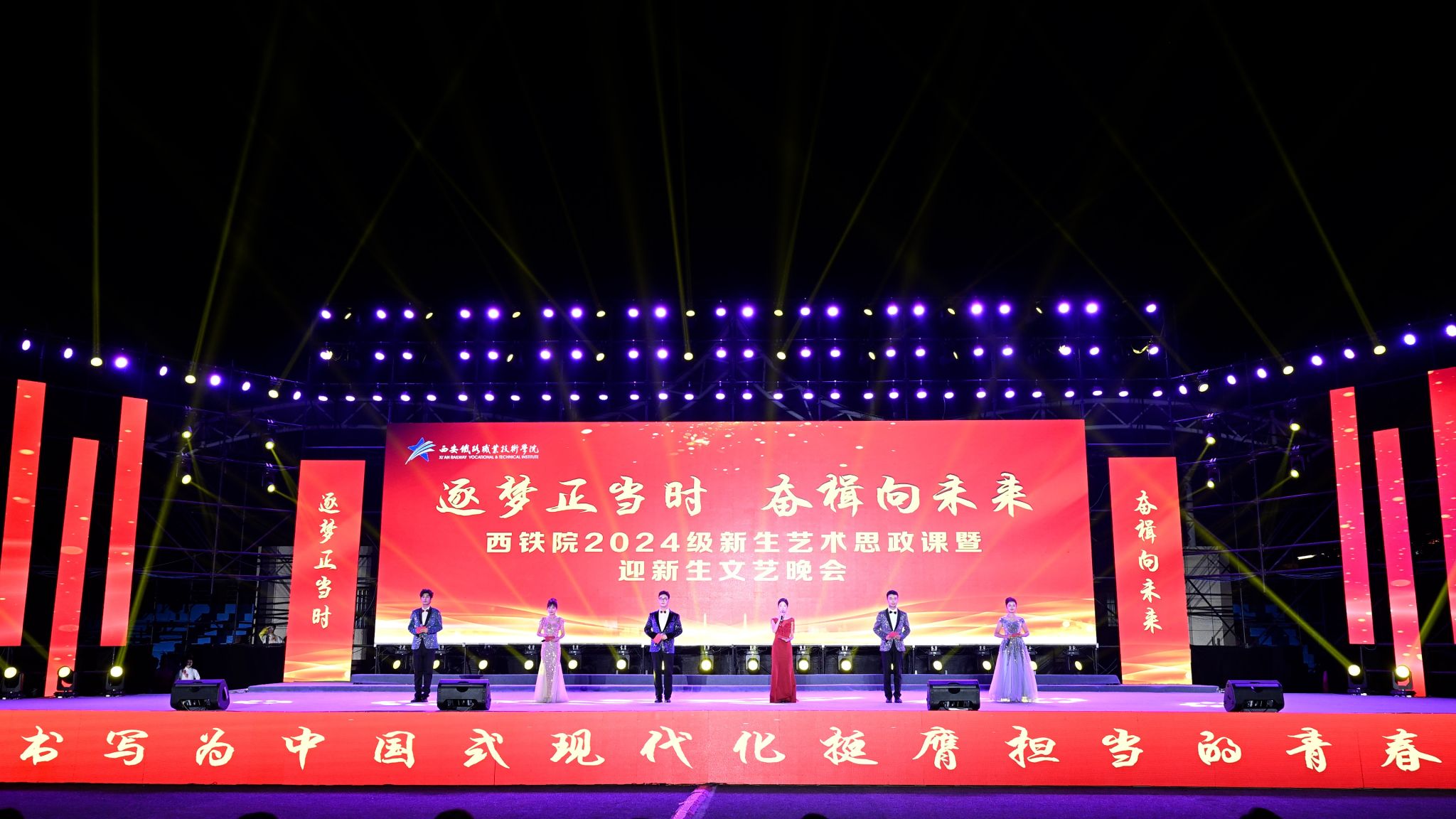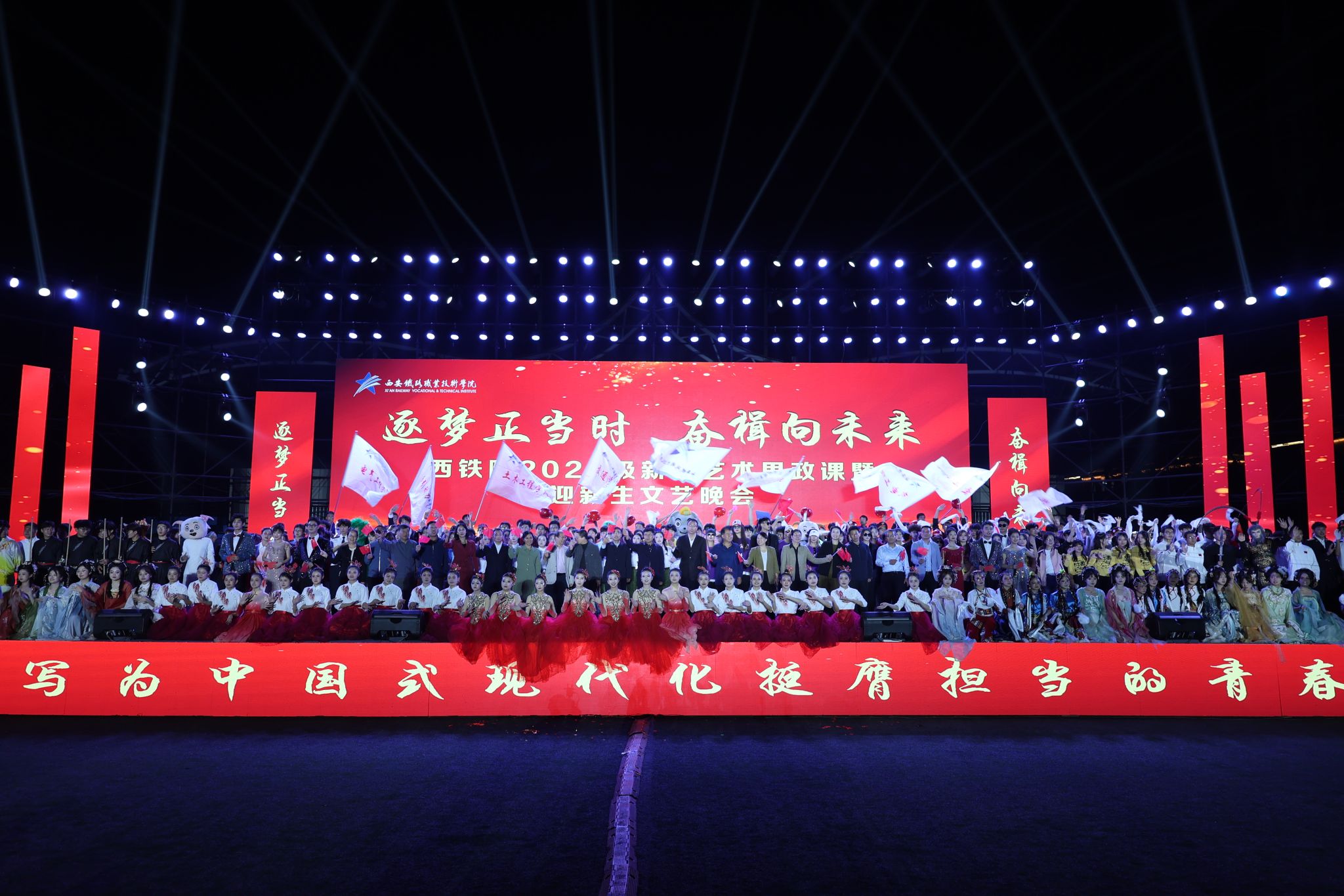 大学生艺术团带来的《九州同》率先点燃了全场气氛,奏响了晚会的序曲。全体新生手摇荧光棒闪出多彩青春,演绎着属于西铁院人的璀璨篇章。