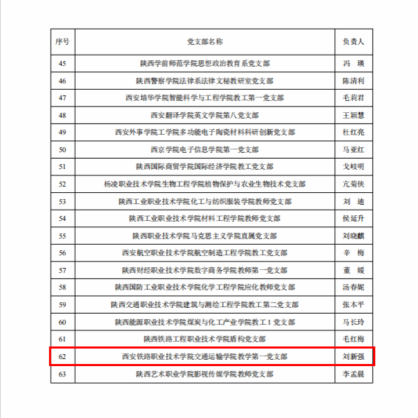 教学第一党支部建立了校级“双带头人”党支部书记工作室,发挥“双带头人”头雁作用,以工作室成员为核心团队成员,主动承担“双高”建设、提质培优、现代教育体系改革、揭榜挂帅等重点项目。主持建成国家级专业教学资源库,主持修订铁路物流管理专业等4项国家专业教学标准,立项建设国家级教师教学创新团队,建成省级课程思政示范课4门、省级精品在线课10门,“手语讲思政”项目获全国新时代“特别受百姓喜爱的终身学习品牌项目”(全国仅有16个)。以西安国际陆港物流市域产教联合体为平台,建设产教融合实训基地(实践中心)等项目3项;以省级校企合作典型生产实践项目、西安市物流产教融合实训中心为依托,培训行业员工2700人次,实现横向经济产值80余万元。