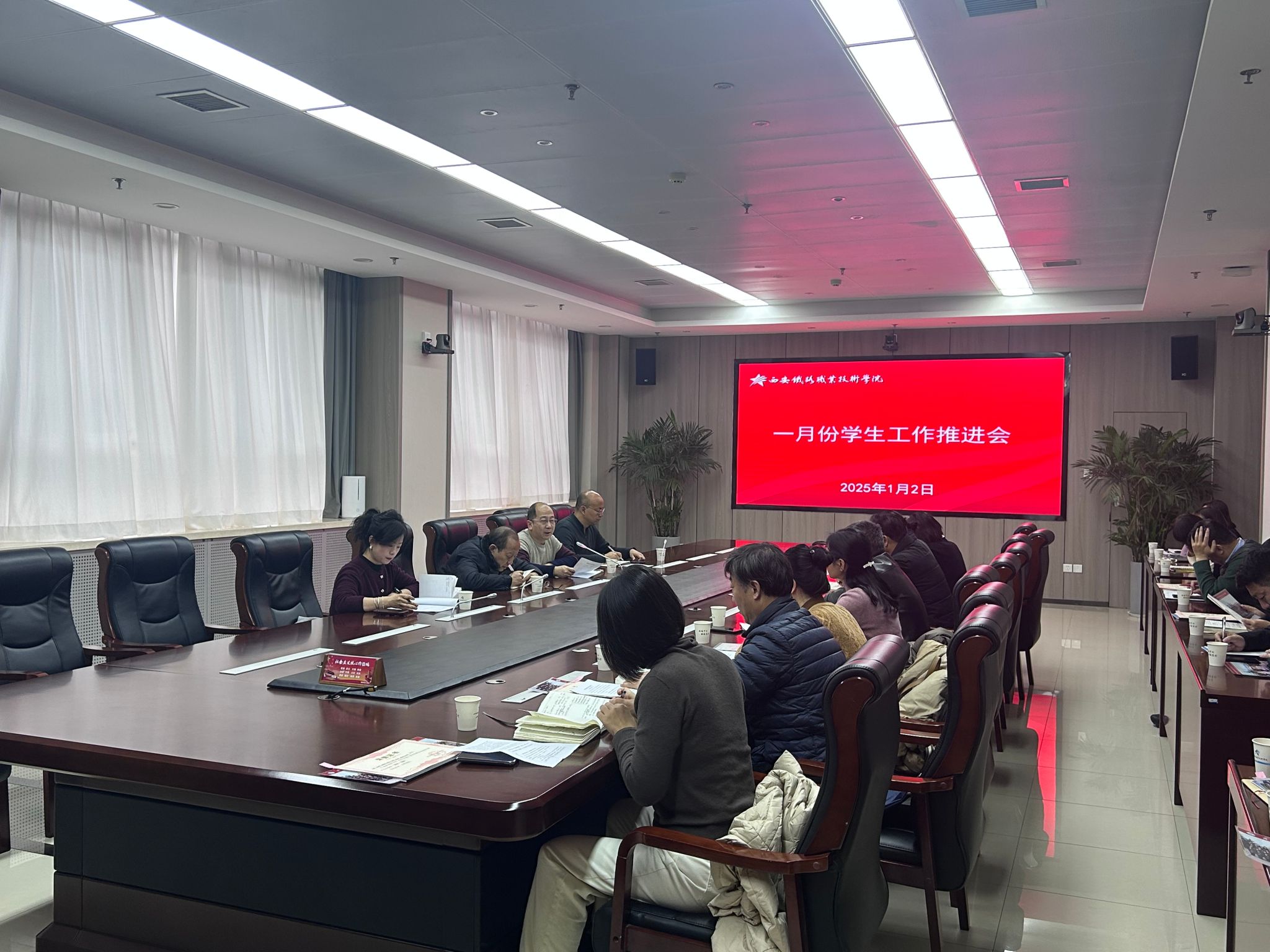 1月2日,学院在港务校区六楼第三会议室召开了一月份学生工作推进会,学院党委副书记任治军,党委学生工作部、团委全体处科级干部,各二级院(部)党总支书记、国际交通学院副院长、基础部副主任以及各院部学工办主任参加会议。会议由党委学生工作部部长李栋主持。