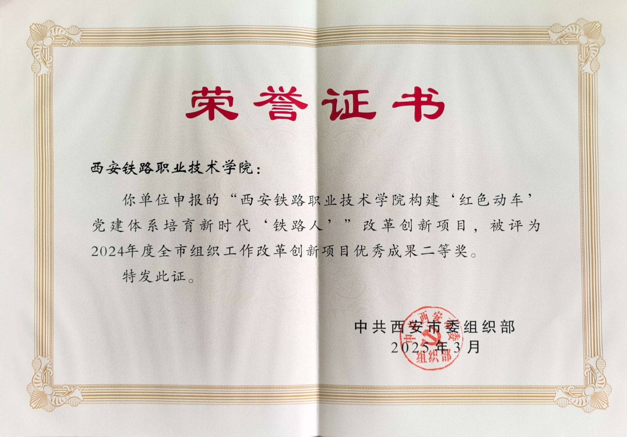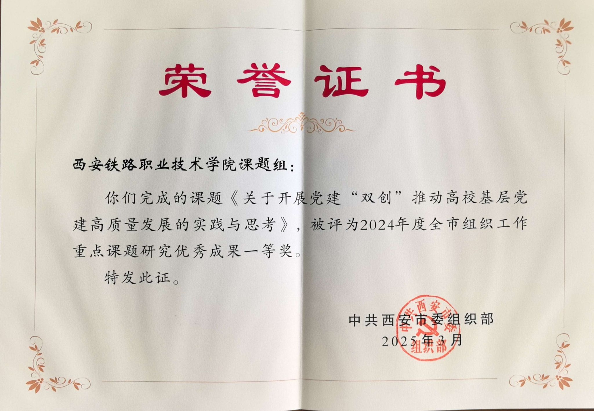 近日,西安市委组织部发布了《关于表彰2024年度全市组织工作重点课题研究优秀成果的通报》(市组通字〔2025〕12号)和《关于表彰2024年度全市组织工作改革创新项目优秀成果的通报》(市组通字〔2025〕11号),永利官网申报的《关于开展党建“双创”推动高校基层党建高质量发展的实践与思考》课题获得“2024年度全市组织工作重点课题研究成果”一等奖。《304am永利集团官网构建“红色动车”党建体系培养新时代“铁路人”》项目获得“2024年度全市组织工作创新项目”二等奖。