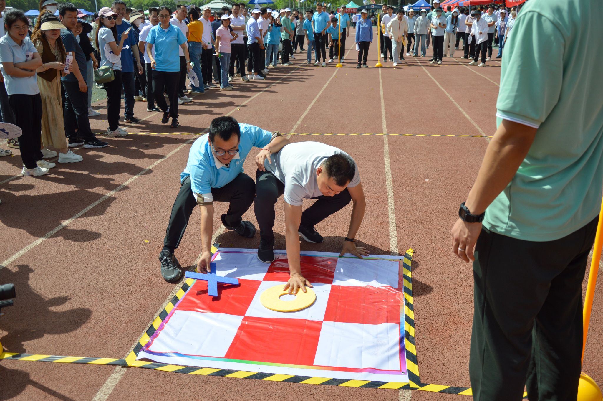 在“棋逢对手”项目里,每队持三枚特制棋子站在起点。开始哨声响起后,老师们飞奔至九宫格区域。他们迅速思考,有的果断落子占关键位,有的则观察局势、谨慎出手。各队激烈交锋,每当有队伍快连成一线,现场观众都紧张屏息。随着最后一子落下,胜负分晓,喝彩与叹息声交织。