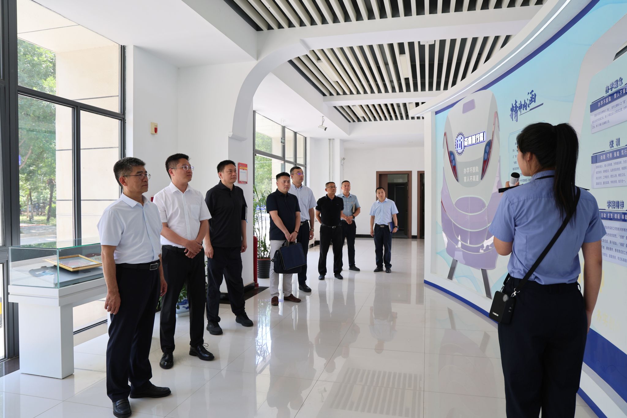 杨帆一行在赵春平等领导陪同下,先后参观了校史馆、轨道交通专业综合实训中心及牵引动力学院实训基地。在宣传部讲解员的引导下,杨帆一行通过校史馆的图文展陈,全面了解学院发展历程与办学特色;随后实地考察了国家级虚拟仿真实训基地、地铁及高铁模拟驾驶实训中心等设施,对学院在轨道交通领域的高水平实训能力给予高度评价。
