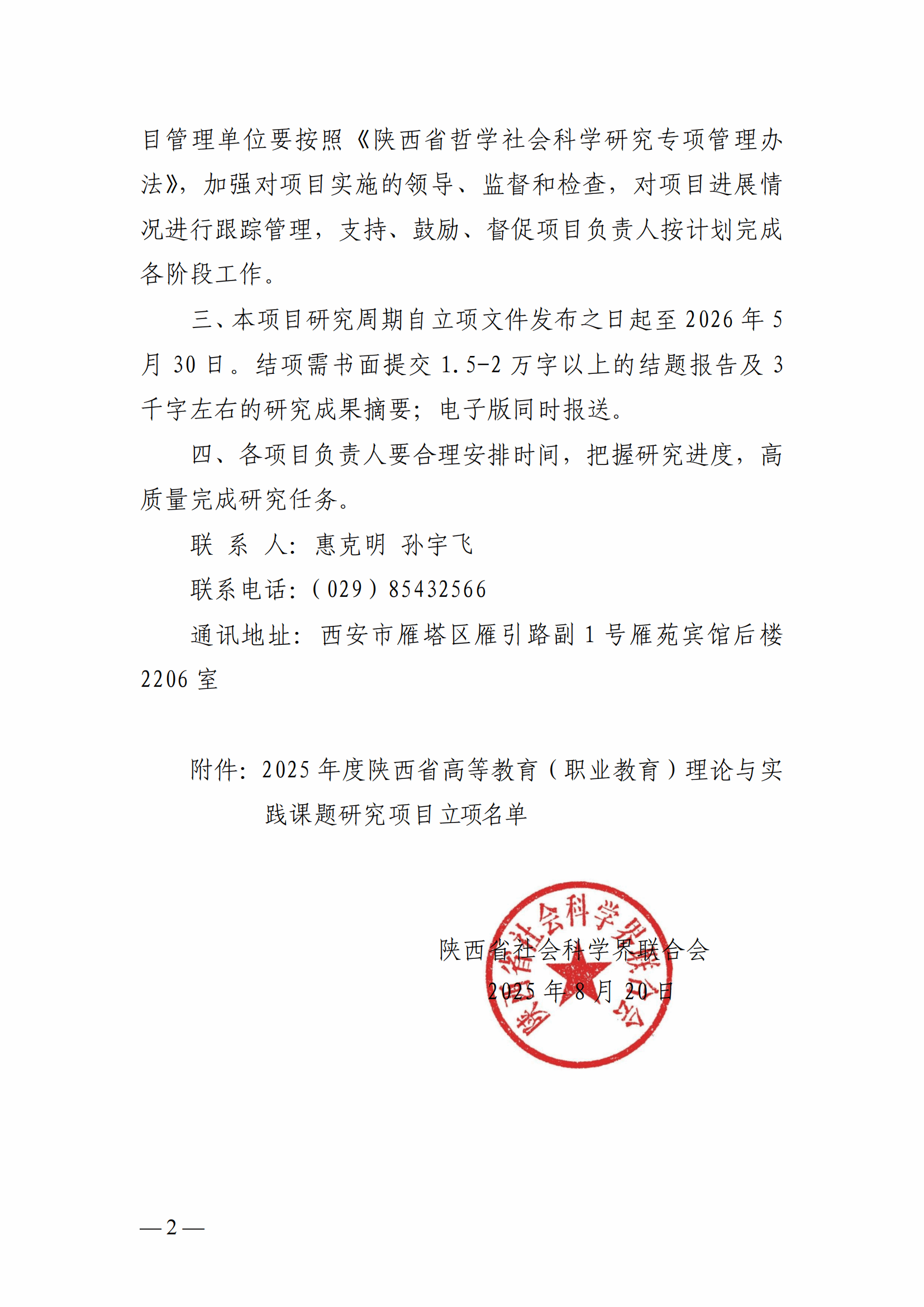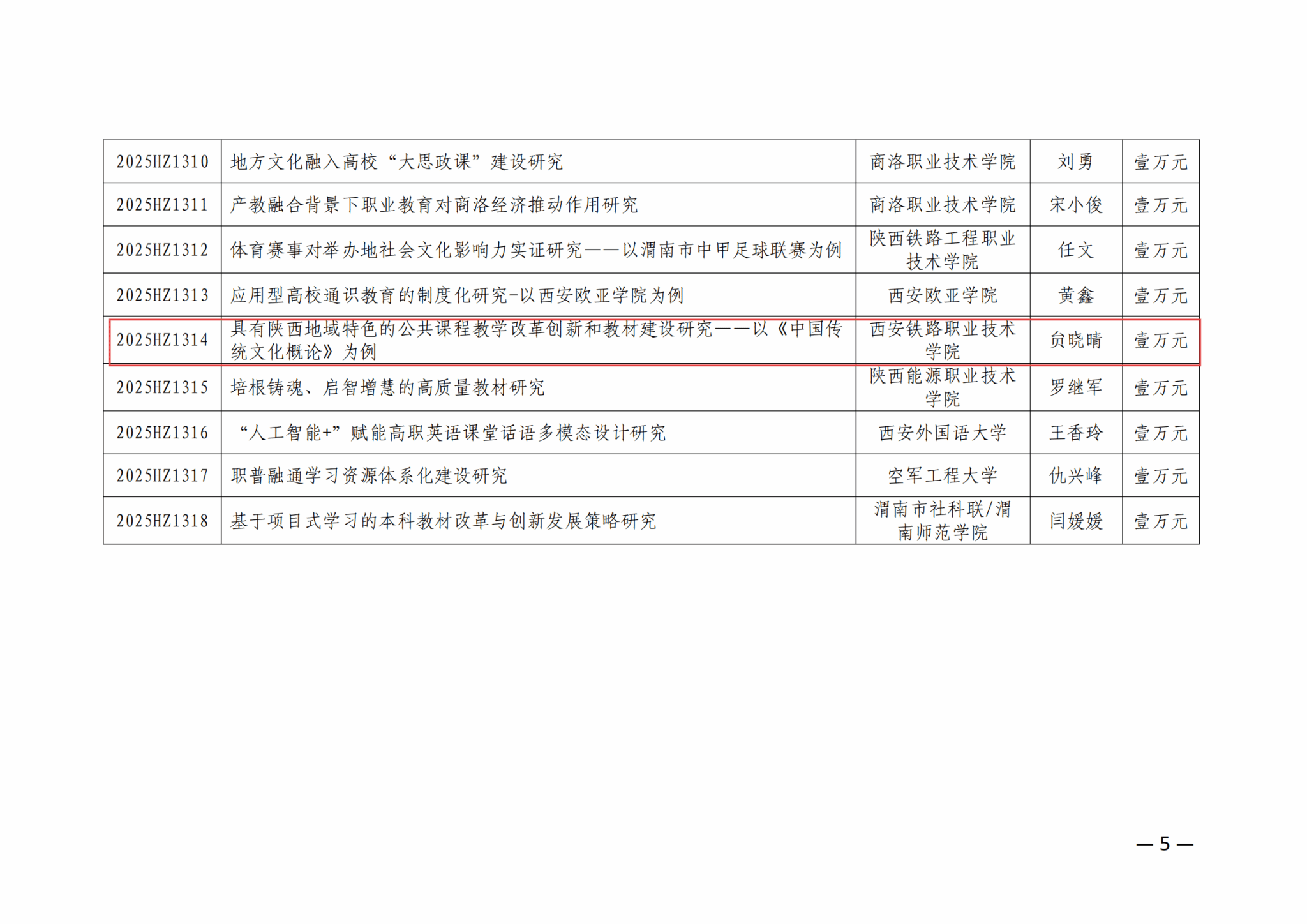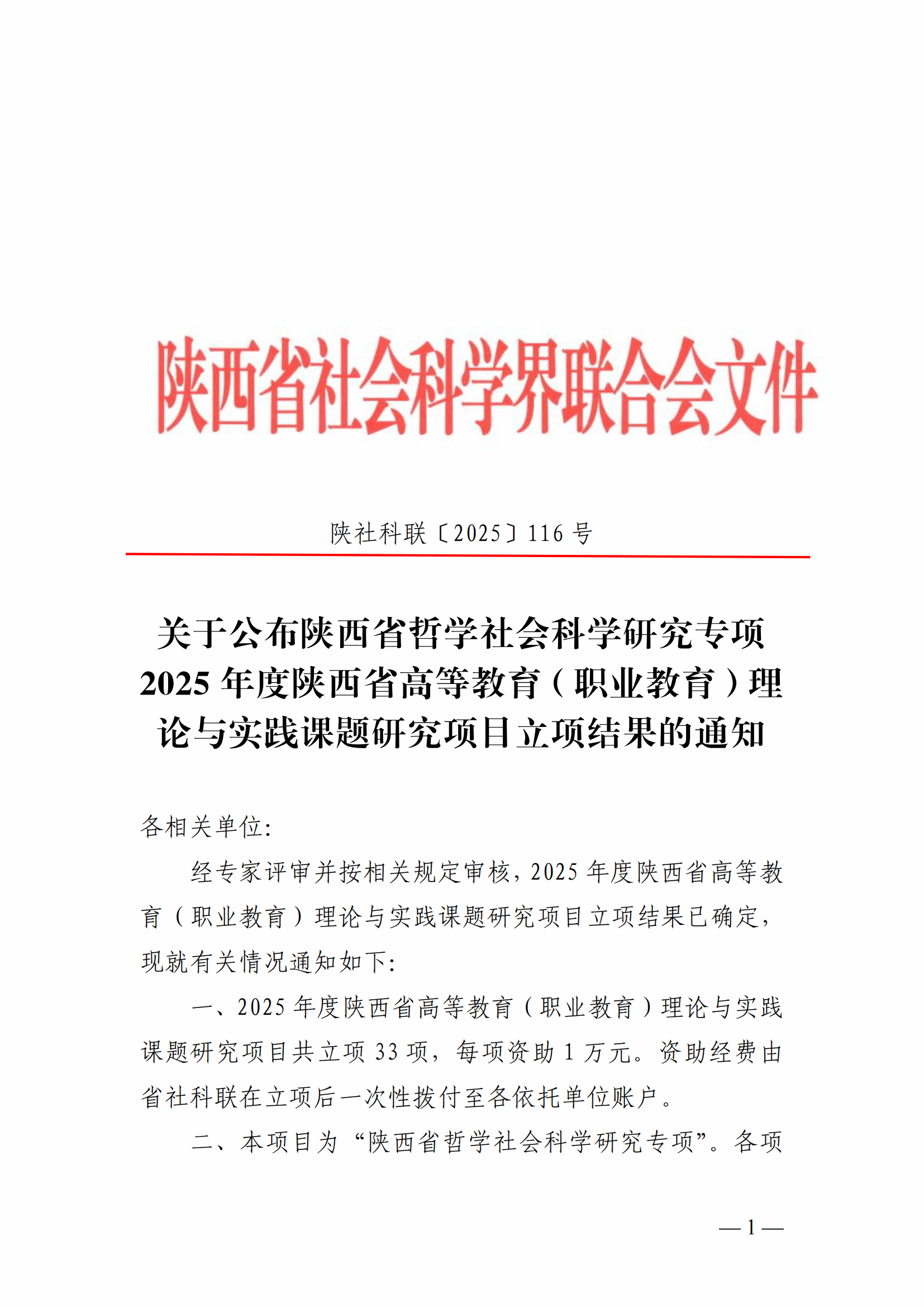 8月22日,从陕西省社科联传来喜讯,学院贠晓晴老师主持的《具有陕西地域特色的公共课程教育改革创新和教材建设项目——以<中国传统文化概论>为例》成功获批2025年度陕西省哲学社会科学专项高等教育(职业教育)理论与实践课题研究项目,这是继2022年学院成功立项两项陕西省社科联哲社科“全面推进乡村振兴与共同富裕”专项项目后的再次立项。此次省社科联共立项33项项目,其中16项为高职院校立项。