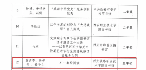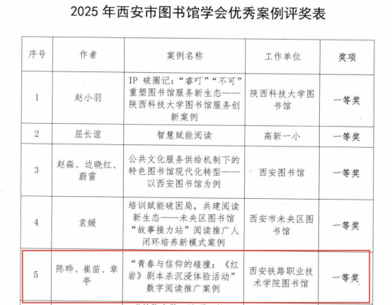 近日,西安市图书馆学会主办的“2025年西安市图书馆学会创新案例征集”活动已圆满落幕。永利官网图书馆陈晔、崔苗、章亭的《“青春与信仰的碰撞:<红岩>剧本杀沉浸体验活动”数字阅读推广案例》案例荣获一等奖。童西香、杨柳青、孙华文的《AI—智绘阅读》案例荣获三等奖。
