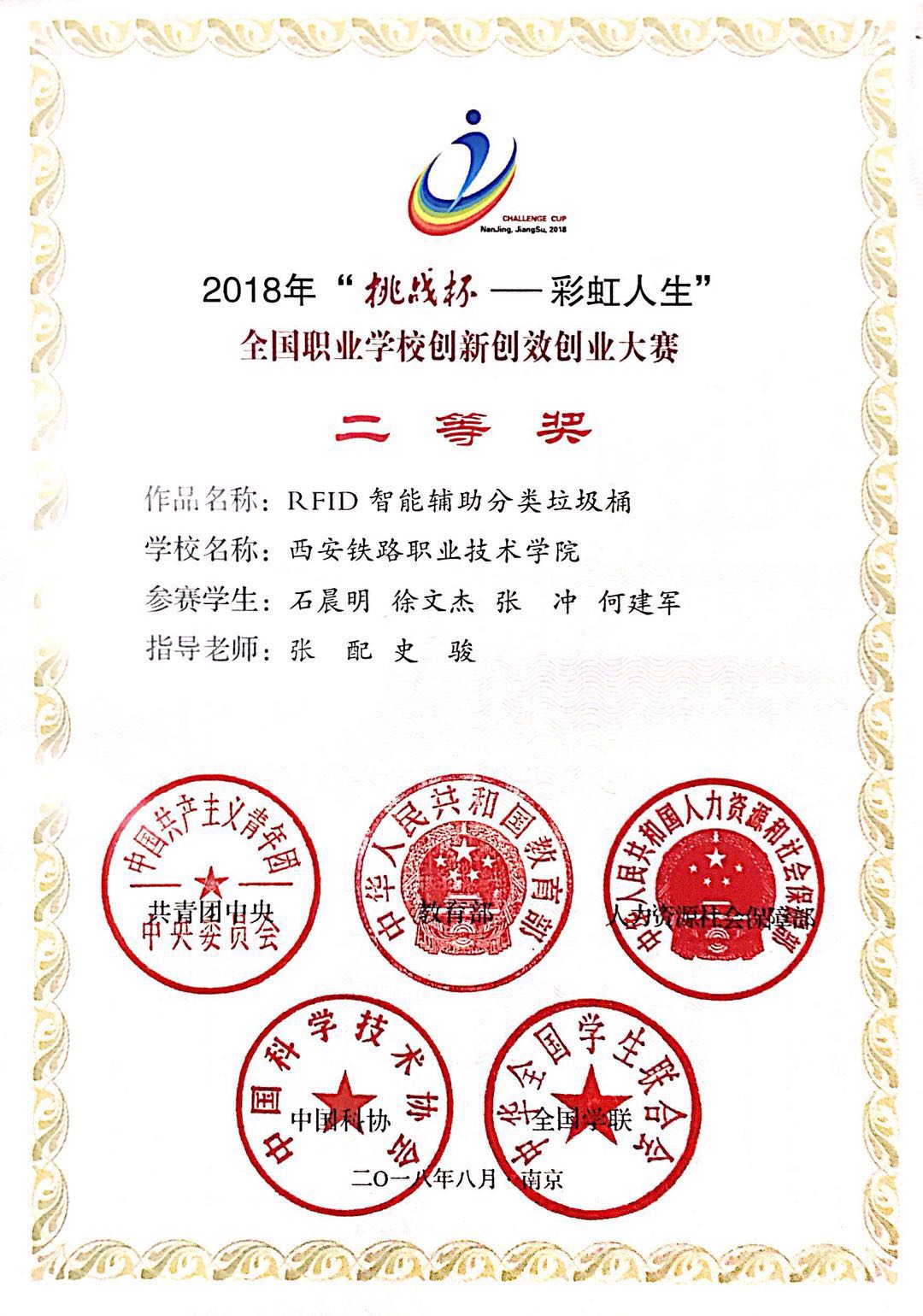 8月14至17日,由共青团中央、教育部、人力资源和社会保障部、中国科协、全国学联、江苏省人民政府共同主办的2018年“挑战杯——彩虹人生”全国职业学校创新创效创业大赛决赛在南京举行。永利官网机电工程学院史骏、张配老师指导的学生作品《RFID智能辅助分类垃圾桶》,经过专家复赛和决赛的严格评审,最终荣获全国“二等奖”的优异成绩。