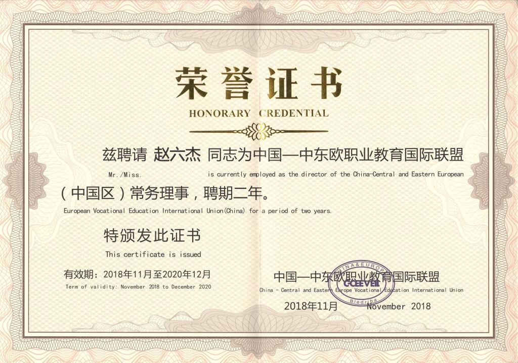 为加强与中东欧国家的教育合作与交流,由中国—中东欧职业教育国际联盟(C-CEEVEIL)主办,中国网和波罗的海研究与发展研究所协办的“中国—中东欧职业教育国际交流研讨会”于2018年11月23日至25日在北京举办,同期举行了“中国—中东欧职业教育国际联盟(中国区)成立会”。永利官网当选为常务理事单位,副院长赵六杰当选为常务理事。