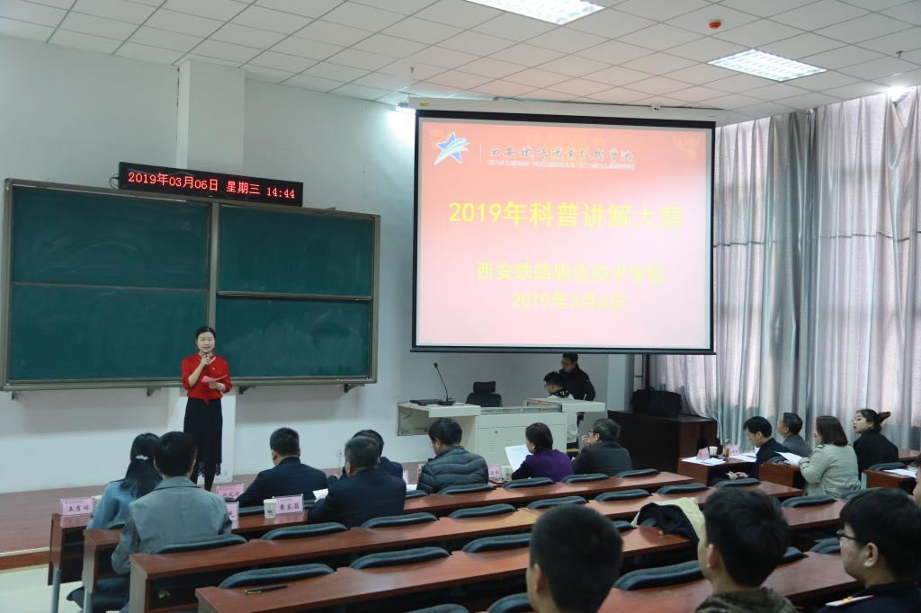 大赛由土木工程学院副院长王秀丽、机电工程学院院长代礼前、电气工程学院总支书记任建国、电子信息学院院长孙津平、基础部主任孙明魁、交通运输学院总支书记仵崇智、牵引动力学院院长李益民、国际交通学院院长赵景民、思政部主任景延鹏担任评委,由2018年学院科普讲解大赛一等奖获得者程颖菲主持。