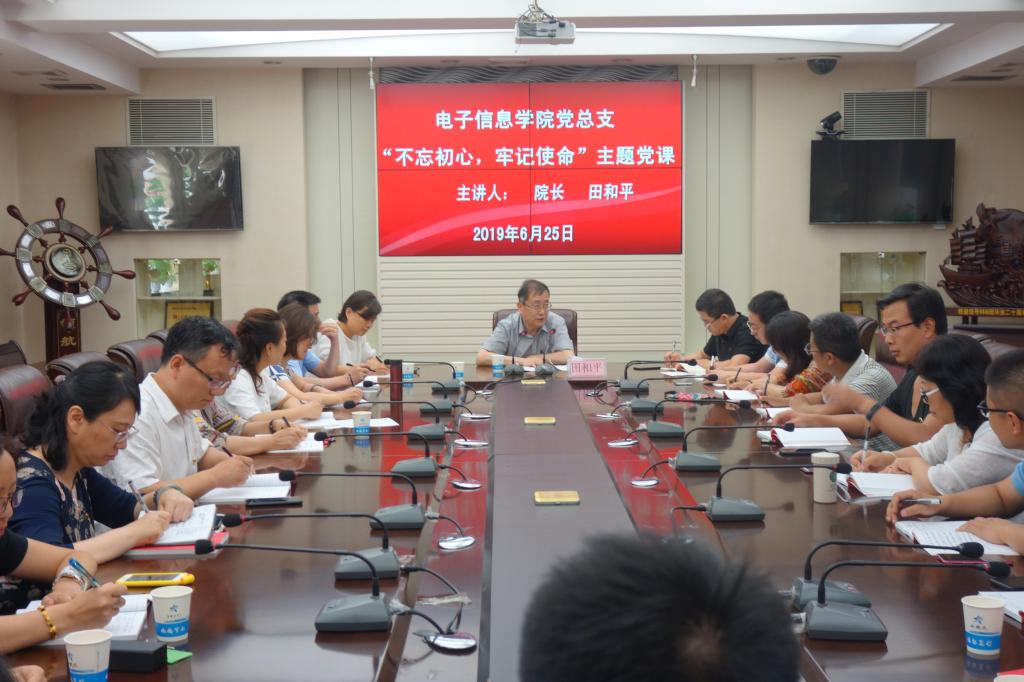 院长田和平从“初心”、“使命”两个关键词和“高校”、“高校教师”两个关键点出发,为电子信息学院党总支全体党员就新形势下教职工的使命和责任担当提出三点要求。一是把好方向,时刻增强政治意识,坚定理想信念,用习近平新时代中国特色社会主义思想来教育学生,武装学生;二是立德树人,用“四有”好老师标准,做学生锤炼品格、学习知识、创新思维、奉献祖国的引路人;三是要加强业务学习和能力建设,培养国际视野,开阔专业眼界,提高教育教学能力。