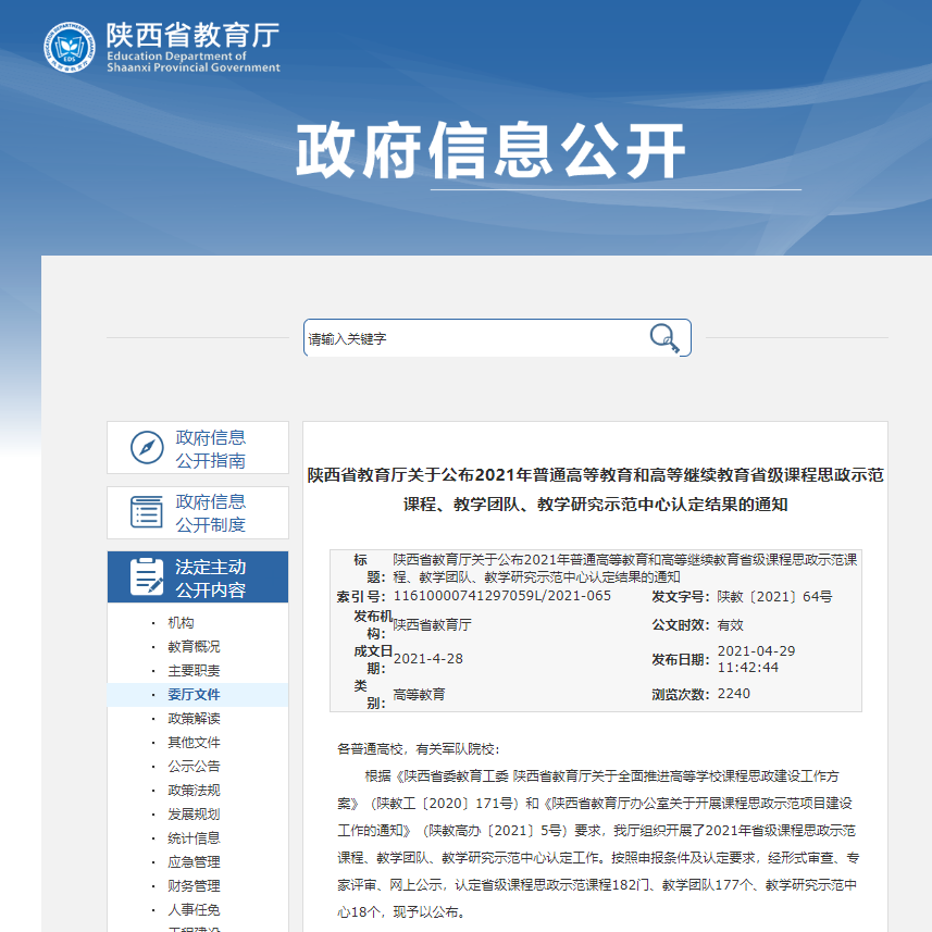 据悉,此次评选根据《陕西省委教育工委 陕西省教育厅关于全面推进高等学校课程思政建设工作方案》(陕教工〔2020〕171号)和《陕西省教育厅办公室关于开展课程思政示范项目建设工作的通知》(陕教高办〔2021〕5号)要求,学院按照申报条件提交资料,经省厅形式审查、专家评审、网上公示等评选流程,最终在全省范围内共计认定省级课程思政示范课程182门,永利官网《计算机应用基础》课程位列继续教育类获奖团队之列。