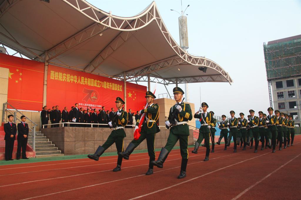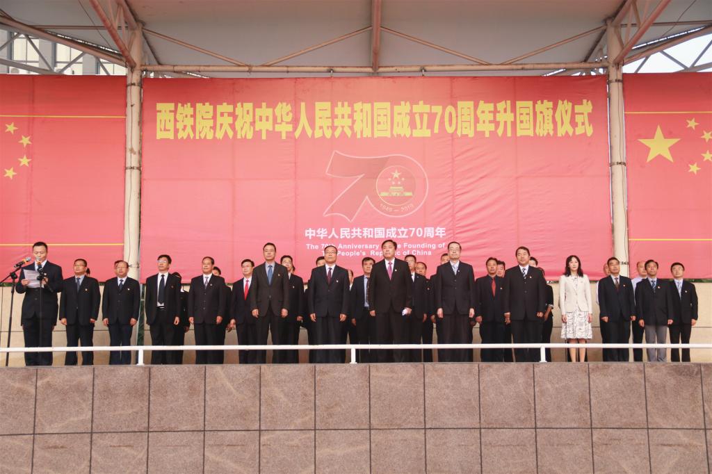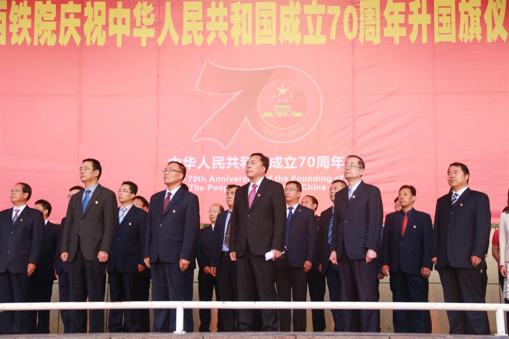 上午7时,在全场师生的注目礼下,西铁院国旗护卫队护送着鲜艳的五星红旗入场,伴随着激昂雄壮的国歌,鲜艳的五星红旗冉冉升起,迎风飘扬,全体师生肃立,一同面向国旗行注目礼,表达对伟大祖国的热爱与敬意。升旗礼毕后,学生代表李宣衡同学进行国旗下演讲,他说:“在庆祝新中国成立70周年之际,作为西铁院青年学子,与祖国同梦想,争做有理想、有本领、有担当的新时代青年,为实现中华民族伟大复兴的中国梦而砥砺奋进!”