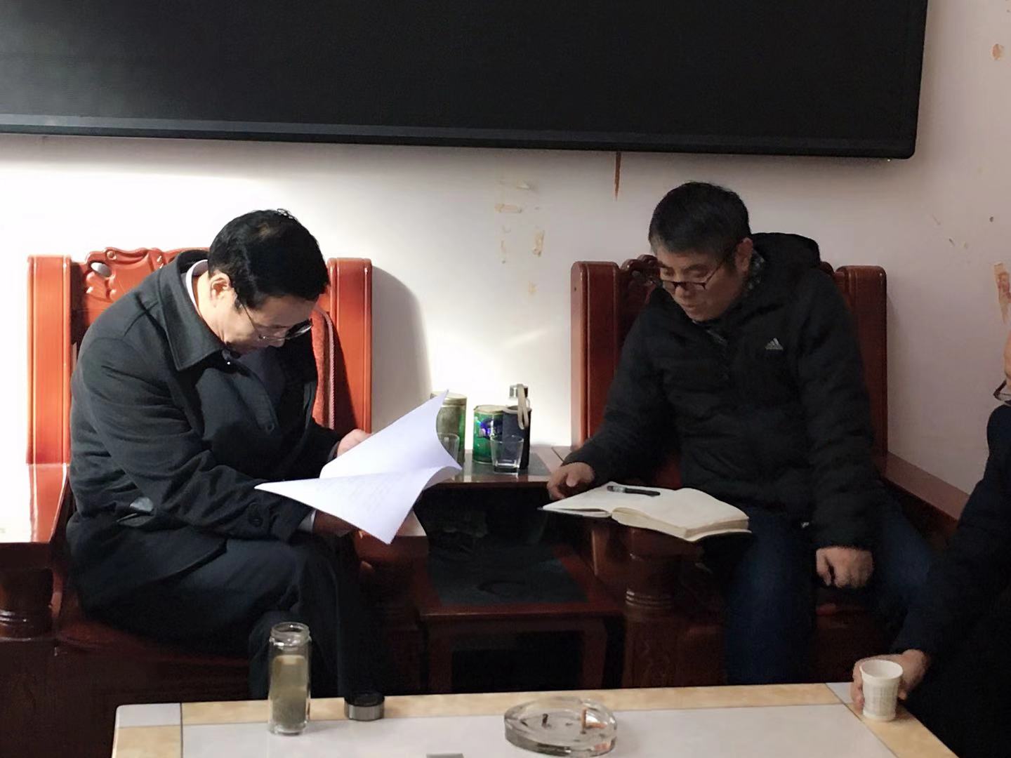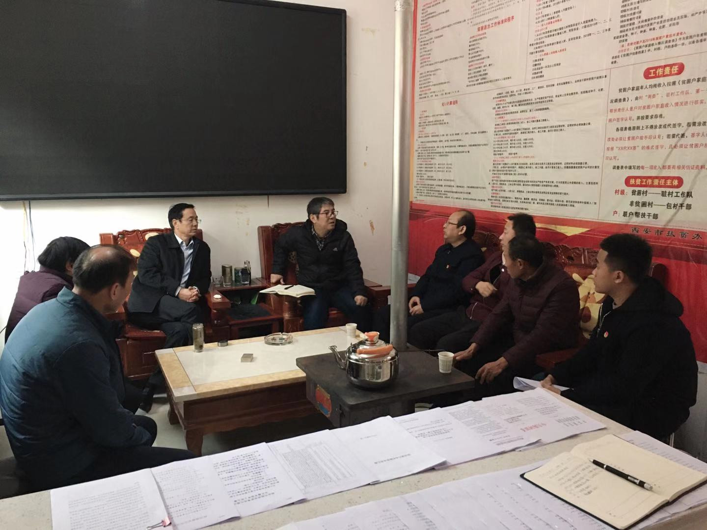 在六合村村委会,学院驻村工作队队长任卫东对照本年度帮扶计划从基层党建、产业帮扶、移民搬迁、教育扶智等方面向赵六杰详细汇报了各项帮扶工作完成情况,并介绍了产业帮扶项目已产生的收益。