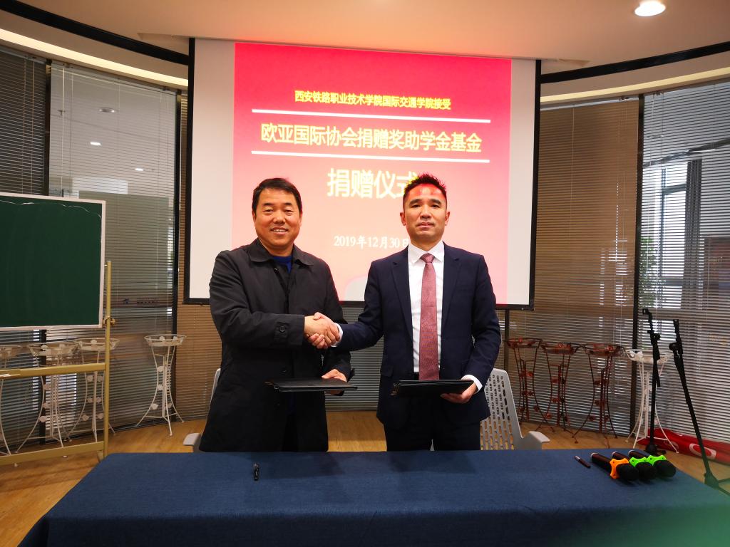 12月30日,在国际交通学院国际交流中心的汇报厅,举行了欧亚国际协会向国际交通学院捐赠奖助学金签约及捐赠仪式。仪式由国际交通学院赵景民院长主持,欧亚国际协会会长冯耀武、学院副院长安学武、国际交通学院副院长韩发强及学院教职工代表、学生代表参加了仪式。