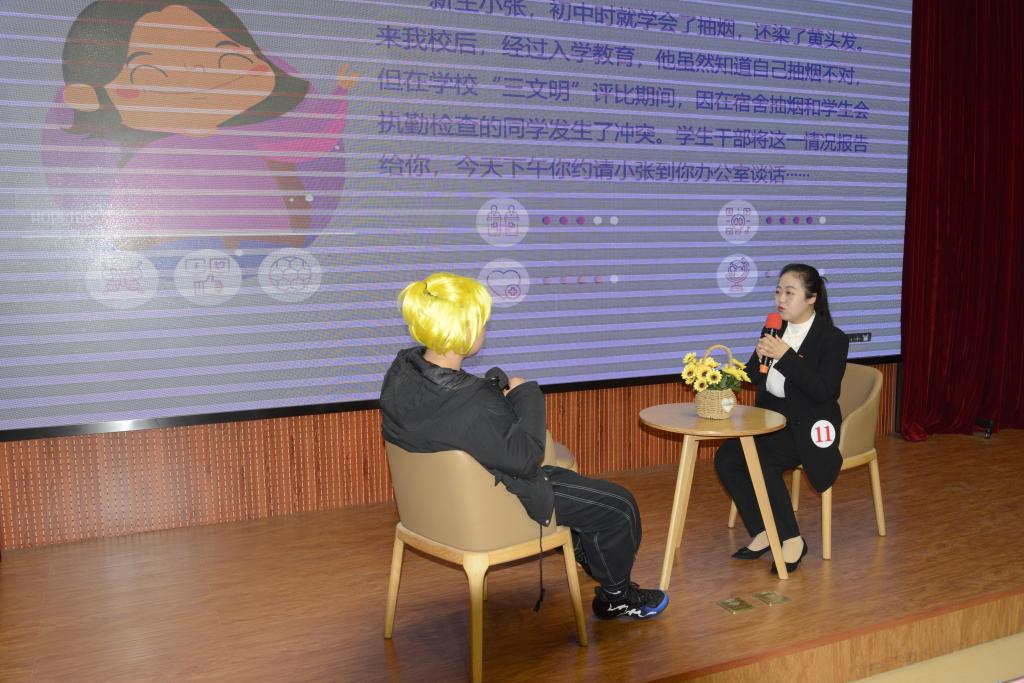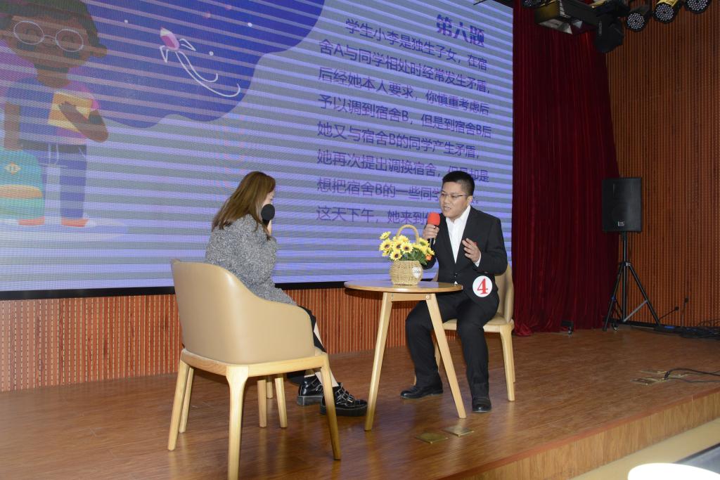 本届大赛和省赛保持一致,分四个环节进行。第一环节为基础知识测试,第二环节为案例分析,第三环节为理论宣讲,第四环节为谈心谈话。第四环节谈心谈话比赛共有来自全院七个二级学院的12名参赛选手。谈心谈话比赛,主要考察辅导员对相关政策、学生特征、学生成长成才规律的了解把握及对学生的教育引导能力。参赛选手赛前20分钟抽题,限时6分钟,根据题目要求,围绕“疫情期间学校请销假管理制度执行问题”“就业面试问题”“家庭经济困难学生问题”“三文明评比活动”“学生干部管理问题”“宿舍矛盾问题”六个题目,以情景再现的方式开展谈心谈话。