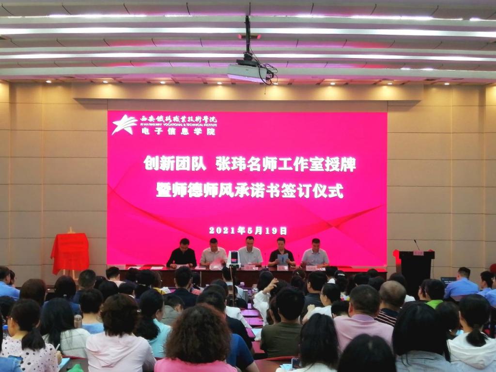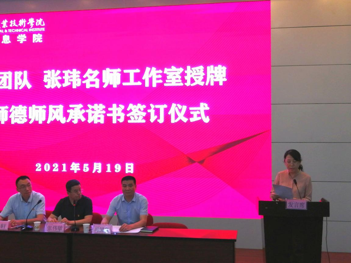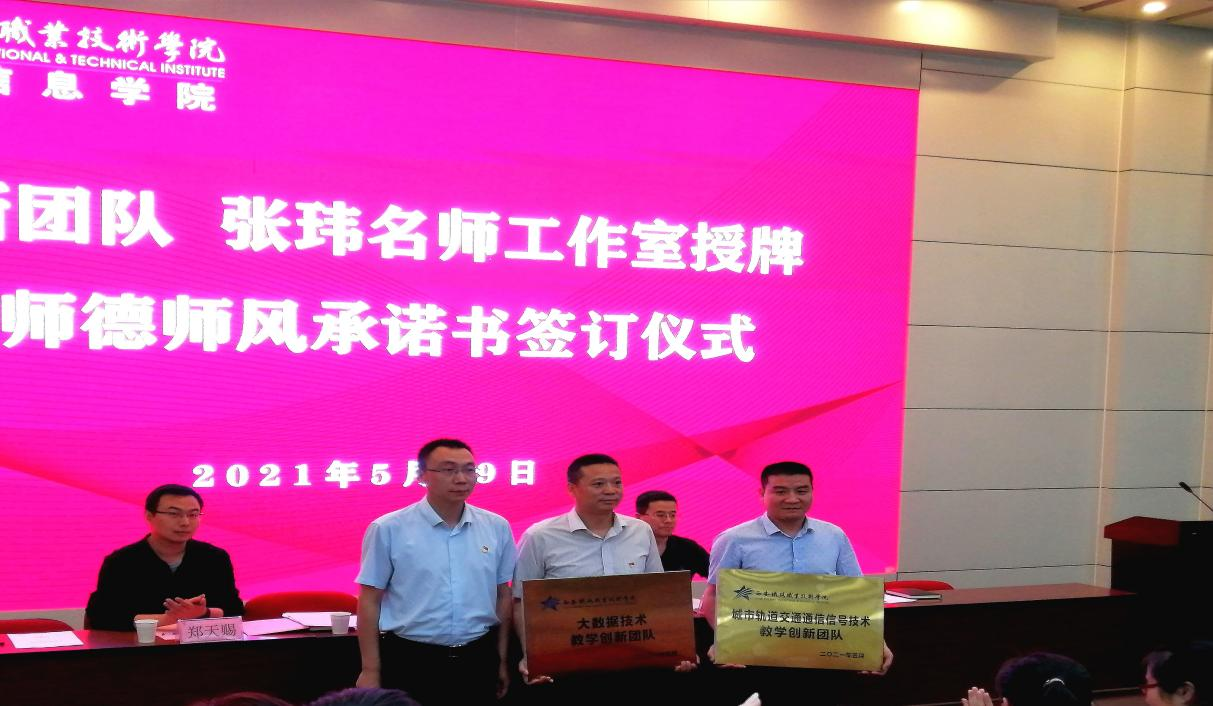 5月19日下午,电子信息学院教师教学创新团队、名师工作室授牌暨师德师风承诺书签订仪式在自强校区阶梯教室举行。学院党委副书记、纪委书记邓轩、电子信息学院院长董奇、副院长冯国良、教师发展规划处发展规划科科长、电子信息学院全体教职工以及部分学生代表参加此次仪式。授牌仪式由电子信息学院党总支书记张伟敏主持。