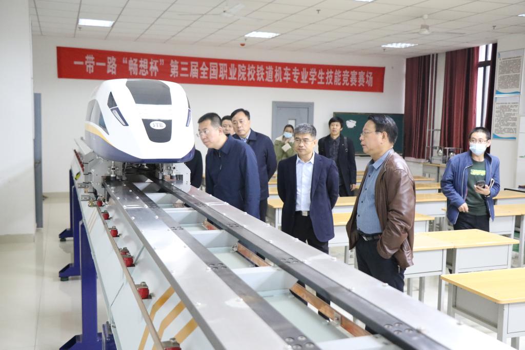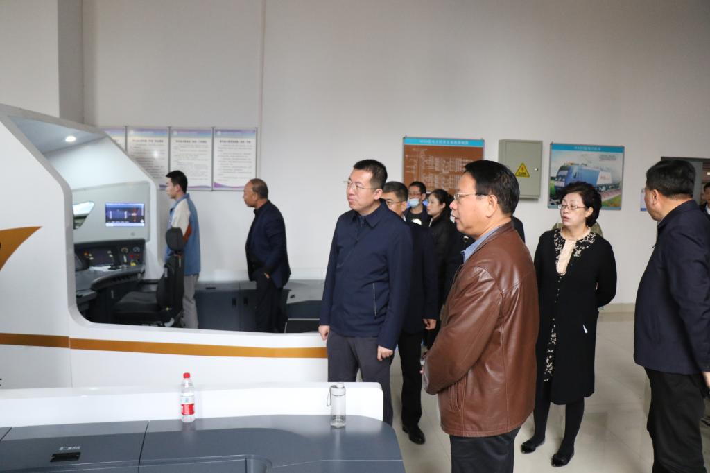 井海滨等人在牵引动力学院院长李益民的讲解下分别参观了CR400BF型复兴号动车组模拟驾驶实训室、HXD3D型大功率交流传动电力机车整车装备实训室、转向架演练场、制动机实训演练场、磁悬浮列车实训室、HXD3C型大功率交流传动电力机车机车一次乘务作业实训中心、CR38080AL型动车组驾驶暨牵引传动实训中心、地铁列车模拟驾驶室、国家级轨道交通职业教育虚拟仿真基地等实验实训中心,近距离了解到西铁院以及牵引动力学院的办学条件和办学实力。