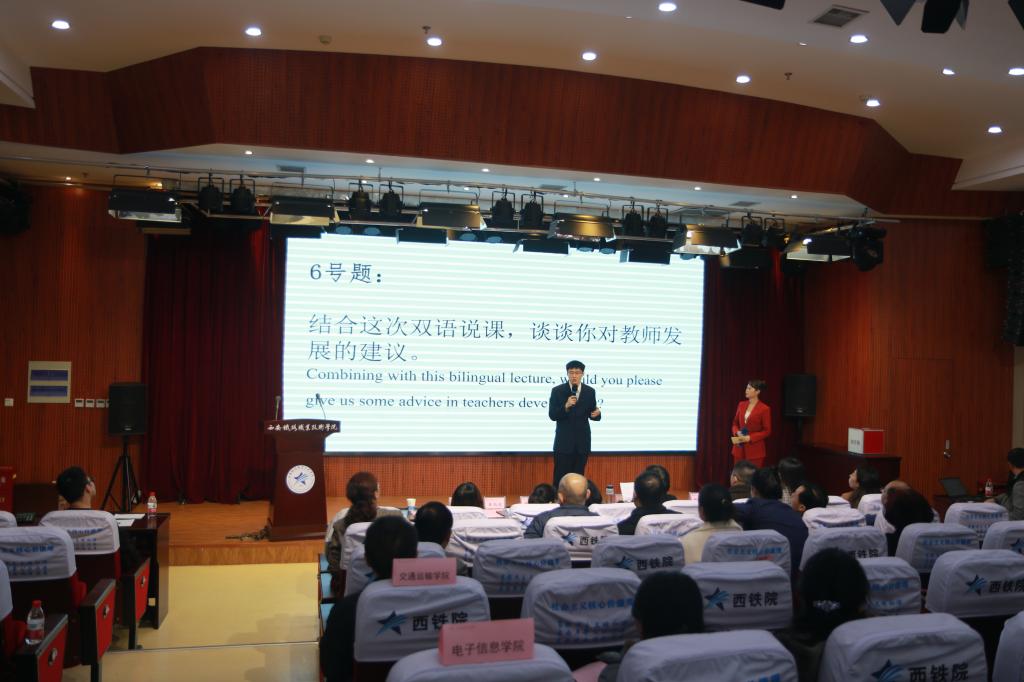 大赛最后,安学武全程用英文进行了赛事总结与点评,将现场的气氛推向了高潮。安学武首先肯定了举办此次“双语”说课大赛的重要性,这是永利官网践行“一带一路”倡议,不断提升国际化办学水平,配合中国高铁“走出去”战略步伐的具体举措;其次,永利官网一定要按照“打造中国特色职教品牌”要求,积极推进中外合作办学、人文交流、留学中国、输出中国标准、推动中国方案解决世界问题;第三,“双语”师资将承担起“双语”教材开发、走出去办学、服务“走出去”企业、开展国际合作,为项目在国外运营培训本土化人才等方面的重任,“双语”教学也是国际化办学必不可少的一部分;第四,全球疫情还未有效控制,国际交流活动难以开展,永利官网要锤炼队伍,苦练内功,积蓄力量,为疫情后的国际化办学打好基础。最后,安学武希望永利官网中青年教师要借助语言能力强、学习能力强、精力旺盛等优势,做好双语教学的准备,为永利官网的国际合作办学储备师资力量。