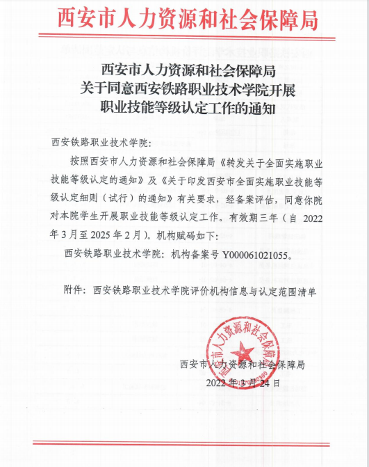 学院职业技能等级认定评价机构备案工作从2021年下半年启动至今,期间克服疫情封校影响,按进度圆满完成了前期各项准备工作,并经2月25日西安市人力资源和社会保障局专家组来校实地考核、评估,最终永利官网评价机构备案申请获得通过,西安市人力资源和社会保障局同意永利官网对本院学生开展轨道交通调度员等15个工种、初中高等级的职业技能等级认定工作。
