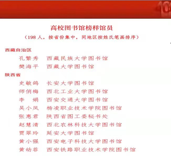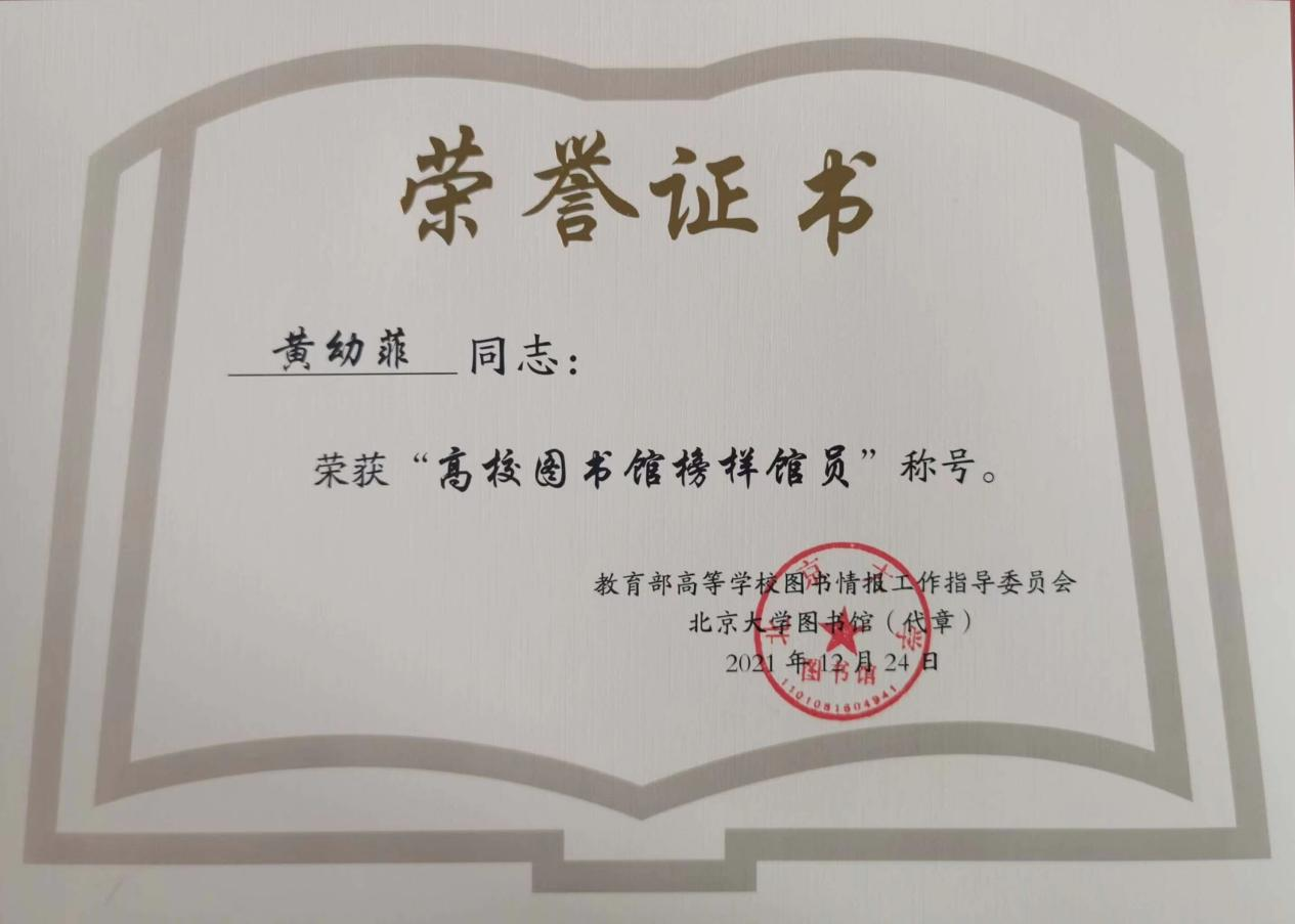 为庆祝教育部高等学校图书情报工作指导委员会成立40周年,近日,教育部高校图工委表彰了一批为实现高校图书馆现代化而长期爱岗敬业、做出突出贡献的榜样馆员。我馆黄幼菲同志荣获“高校图书馆榜样馆员”荣誉称号。