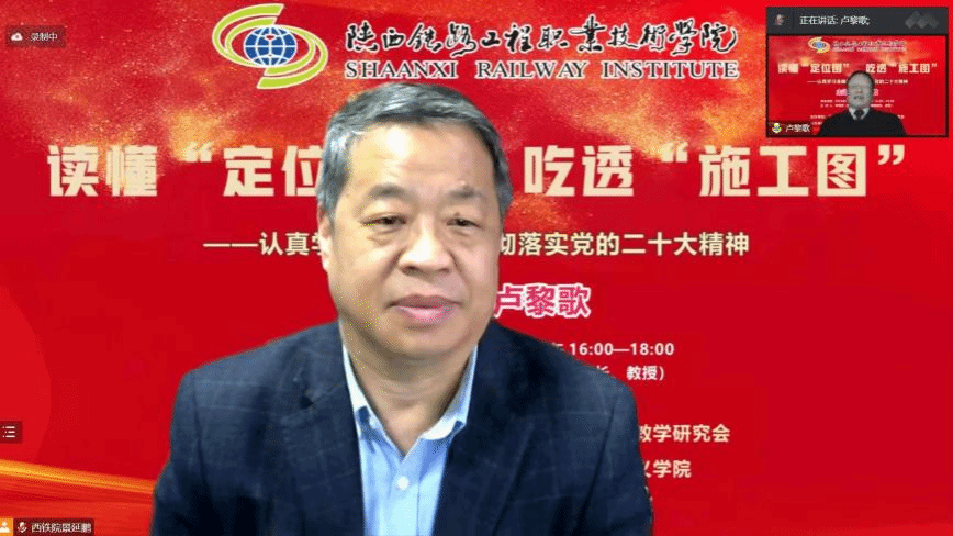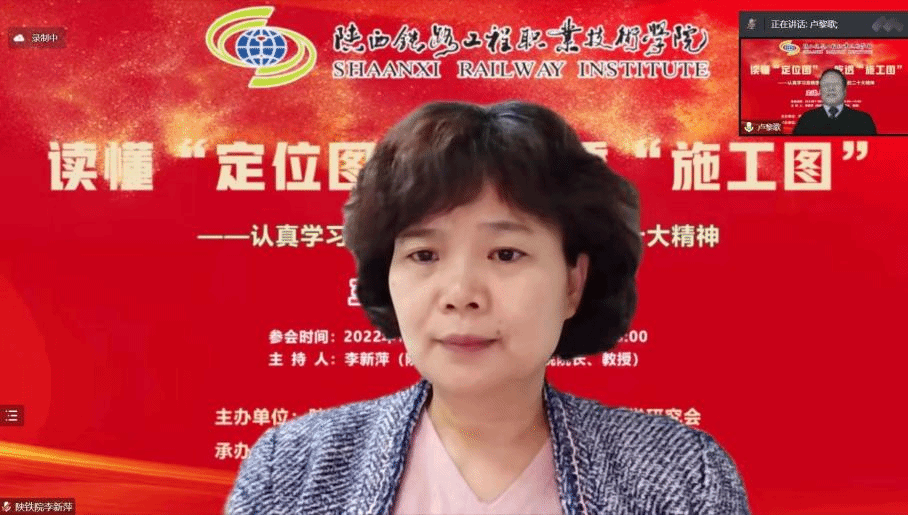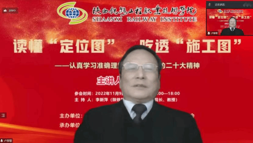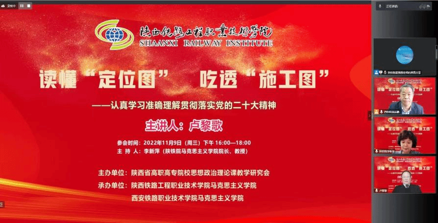 11月9日下午,“党的二十大精神主题报告会”在线上成功举办,本次会议由陕西省高职高专院校思想政治理论课教学研究会主办,陕西铁路工程职业技术学院马克思主义学院、304am永利集团官网马克思主义学院共同承办。会议邀请到了西安交通大学马克思主义学院二级教授、博士生导师卢黎歌教授,作了题为“读懂‘定位图’ 吃透‘施工图’——认真学习准确理解贯彻落实党的二十大精神”的主题报告。陕西省高职高专思政课教学研究会副会长、陕铁院马克思主义学院院长李新萍教授主持会议,陕西省高职高专思政课教学研究会副会长、西铁职院马克思主义学院院长景延鹏出席并发言。会议吸引了省内省外、线上线下共22所高校及单位、260余名思政教师热情参与。永利官网马克思主义学院60多位专兼职思政课教师在线参加了报告会。