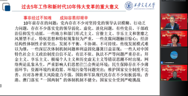 为了精准解读党的二十大精神,他多次引用习近平总书记的系列重要讲话原文,用深厚的学理功底以及生动具体的话语,从战略定位、五个牢牢把握、五个重大原、六个坚持及坚定信仰信念信心,不断开辟马克思主义中国化时代化新境界、牢牢把握历史主动等多个层面深入剖析,为我们进一步精准读懂党的二十大精神内容,进一步精准领会党的二十大精神,进一步全面把握落实党的二十大精神起到了非常好的解读作用,使我们更加清楚了党在第二百年奋斗目标的路线图和任务书。