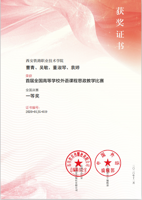 “首届全国高等学校外语课程思政教学比赛”历时半年,分三个阶段、线上+线下模式进行。共有全国29个省、市、自治区771所院校的1500件参赛作品。永利官网参赛团队在基础部组织下积极研究教材,精心筛选素材,认真打磨作品,发挥团队作用,通过科学的教学设计将语言核心素养提升与思想政治教育相结合,发挥课堂教学的育人功能,做到语言教学与立德树人同向同行,以陕西省第一名晋级决赛。最终与来自全国各地20所高职院校的参赛选手经过激烈角逐,在课程设计理念、语言基本功、授课台风等方面充分展现了永利官网教师扎实的教学功底和高超的教学技能,受到大赛评委的一致好评,荣获一等奖。