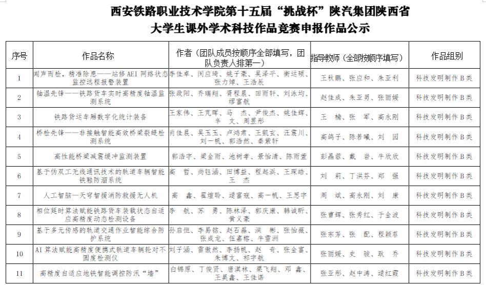 3月26日下午,学院在港务校区举办2025年“挑战杯”大学生课外学术科技作品竞赛校赛决赛。经校外专家评审,以校赛成绩为依据,现将拟推荐入围第十五届“挑战杯”陕西省大学生课外学术科技作品竞赛的11件项目(校赛成绩前11的项目)信息公示如下: