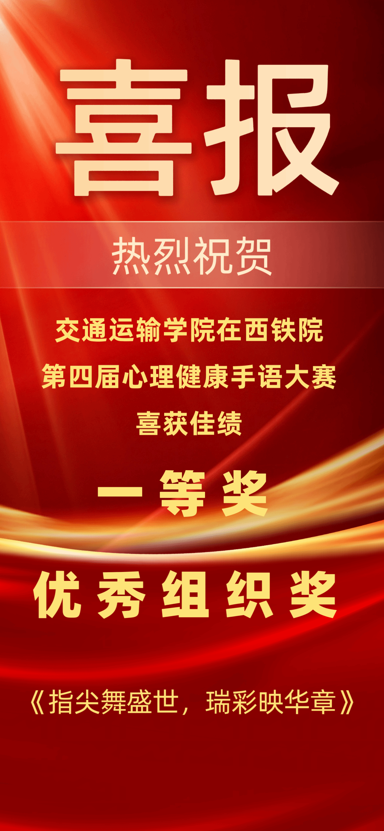 热烈庆祝交通运输学院手语操表演《指尖舞盛世,瑞彩映华章》在西铁院第四届心理健康手语操大赛中荣获一等奖与优秀组织奖。