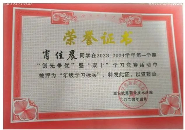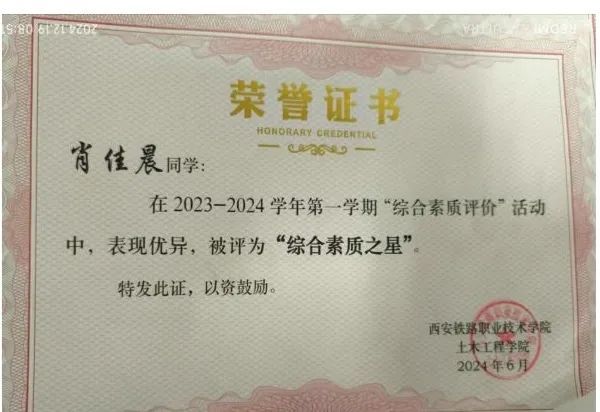 肖佳晨,土木工程学院高速铁路施工与维护专业2301班学生,共青团员。上一学年个人成绩专业第二。担任班级学习委员,学生会学习部部长。荣获国家励志奖学金、三好学生、优秀学生干部、年级学习标兵等荣誉。细心沉稳、善于沟通、乐于帮助同学、随机应变能力强,多次参与各类竞赛和学校组织的志愿者活动。