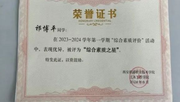 祁博平,土木工程学院工程造价专业2301班学生,共青团员。在校期间努力学习,同时担任学生会文艺部部长一职。参加了“数字化计量与计价省赛”,获得省级三等奖。荣获国家励志奖学金、优秀学生干部、综合素质之星等荣誉。在校期间多次参与学校组织的志愿者活动。