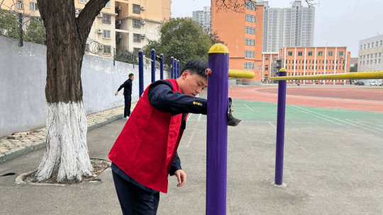随后,团总支干部带领各班志愿者迅速开始了一场意义非凡的校园清扫活动,同学们有条不紊地开展清扫工作。在教学楼前,同学们手持扫帚、簸箕,认真清扫着每一处角落,不放过任何一片落叶、一张纸屑。一些同学还主动清理墙壁上的小广告,他们用铲子小心地铲除,再用湿布仔细擦拭,使教学楼的墙面焕然一新。