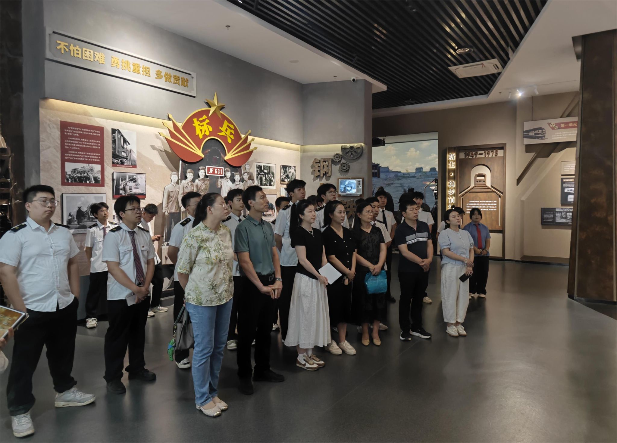师生们跟随讲解员进入馆内参观学习,从宝成铁路到襄渝铁路,再到中欧班列,展馆内的历史文物和修建的模拟场景生动诠释了铁路如何成为连接城市、驱动区域经济发展的重要纽带,一件件珍贵实物、一幅幅历史图片、一幕幕逼真场景,生动展现了中国铁路事业从筚路蓝缕到引领世界的非凡跨越。师生们驻足于记录着陕铁工人攻坚克难、开山架桥的珍贵史料前,深刻感受几代铁路人用汗水与智慧铸就的“钢铁脊梁”精神。