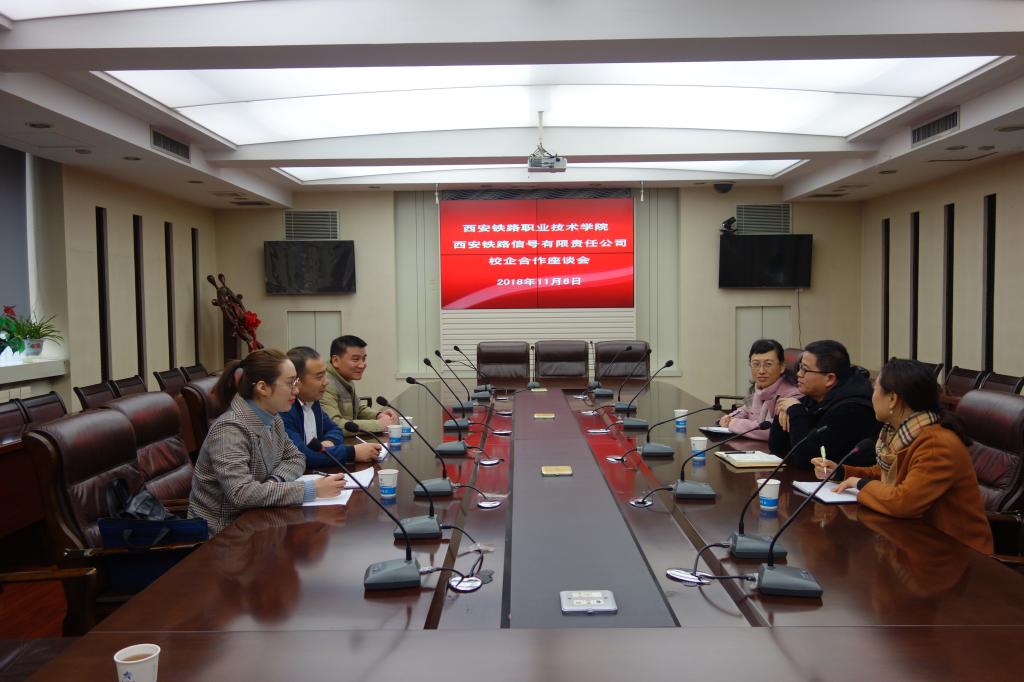 11月6日,电子信息学院与西安铁路信号有限责任公司校企合作座谈会在自强校区举行。西安铁路信号有限责任公司人力资源部主任徐英武和工程师罗荣蕾,以及电子信息学院党总支书记张伟敏、办公室主任马荣、铁道信号教研室主任冯国良和副主任高玉进行了座谈,会议由冯国良主持。