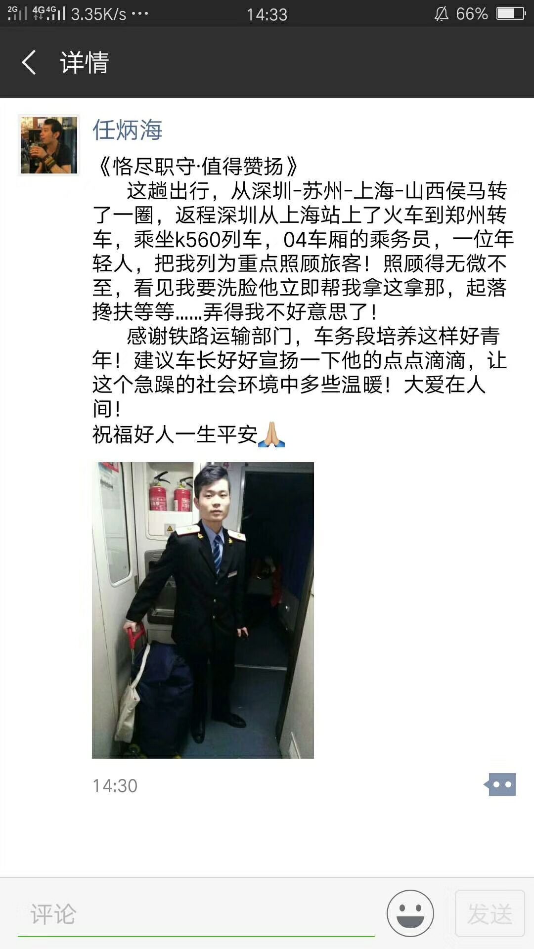 10月2日,旅客任炳海在上海至延安K560的列车上,04车厢乘务员——永利官网牵引动力学院动车驾驶161班毕业生实习生张昕帮忙给旅客拿行李、搀扶其上厕所等,照顾的无微不至。任炳海身有残疾,因5年前动过脑部手术,四肢不便,吐字不清。虽然这是个徽不足道的关怀,却让旅客满怀感激。
