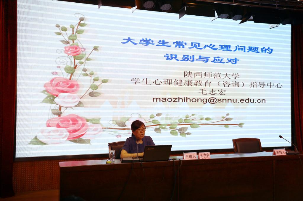 为了进一步提升永利官网学生工作管理队伍人员的心理健康知识水平,提高心理危机干预能力,扎实推进永利官网心理健康教育水平。5月23日下午,党委学生工作部邀请了陕西师范大学学生心理健康指导(咨询)中心主任毛志宏教授来永利官网做了“大学生常见心理问题的识别与应对”专题知识讲座。党委学生工作部部长郭小莉、各二级学院党总支书记、学工办主任、全体辅导员、班主任以及学生代表聆听了讲座。专题讲座由学工部副部长高阿联主持。
