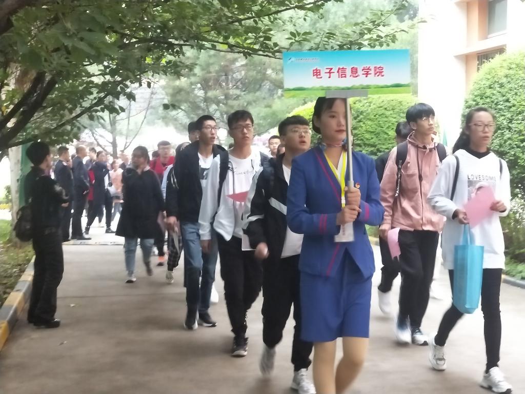 为新生顺利完成报到注册,沿途还放置了报到指示牌,每个环节均有志愿者热情引导,悉心服务,帮助新生能够准确到资格审查处、注册报到处、收费处、绿色通道及物品发放处。电子信息学院还制作了图文并茂的宣传展板,专业特色介绍、优秀教师展示等。