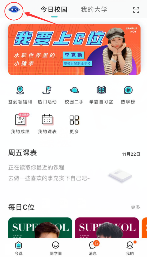 方式二:在今日校园APP中,选择“今选”栏目,点击左上角蓝色机器人图标。